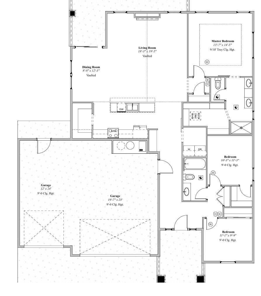 convert this floor plan into a realistic isometric 3d view of a full house show the space from an elevated angle with furniture walls and details visible render a beautiful cottage inspired architectural plan of a house showcasing the layout clearly use soft warm neutrals for the walls like a creamy beige or soft gray with white cabinets and soft grey countertops blue grey doors atmosphere should be inviting and cozy with natural lighting that highlights the open spaces such as the living room and bedrooms use light wood tones for floor indications and subtle greenery at the entrance to suggest landscaping the environment should feel serene and elegant use the same furniture as shows on the plan do not change the orientation of the floorplan