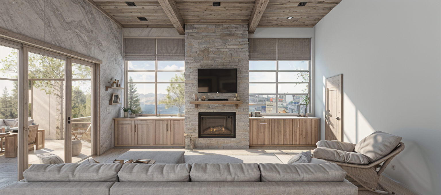 modern exterior shot stone veneer ground floor clapboard siding upper floors asphalt shingle roof lush vegetation in foreground active sidewalks with people and cars architecture
