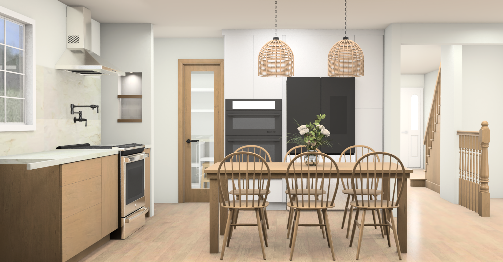 add recessed lights to the ceiling change the view from the window to more green nature and the glass to be cleaner change the shade of the backsplash to a lighter one the walls are white
