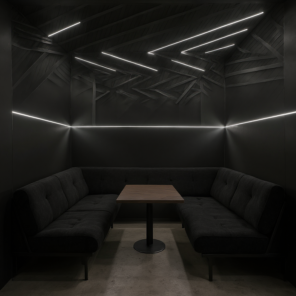 black matte wool minimalist sofas no seams or buttons in seat black base underneath concrete floor black plaster ceiling with 10 white led striplights at a 45 degree angle black walls with seamless mirror strips all the way to the ceiling infinity effect when the striplights reflect in the mirror