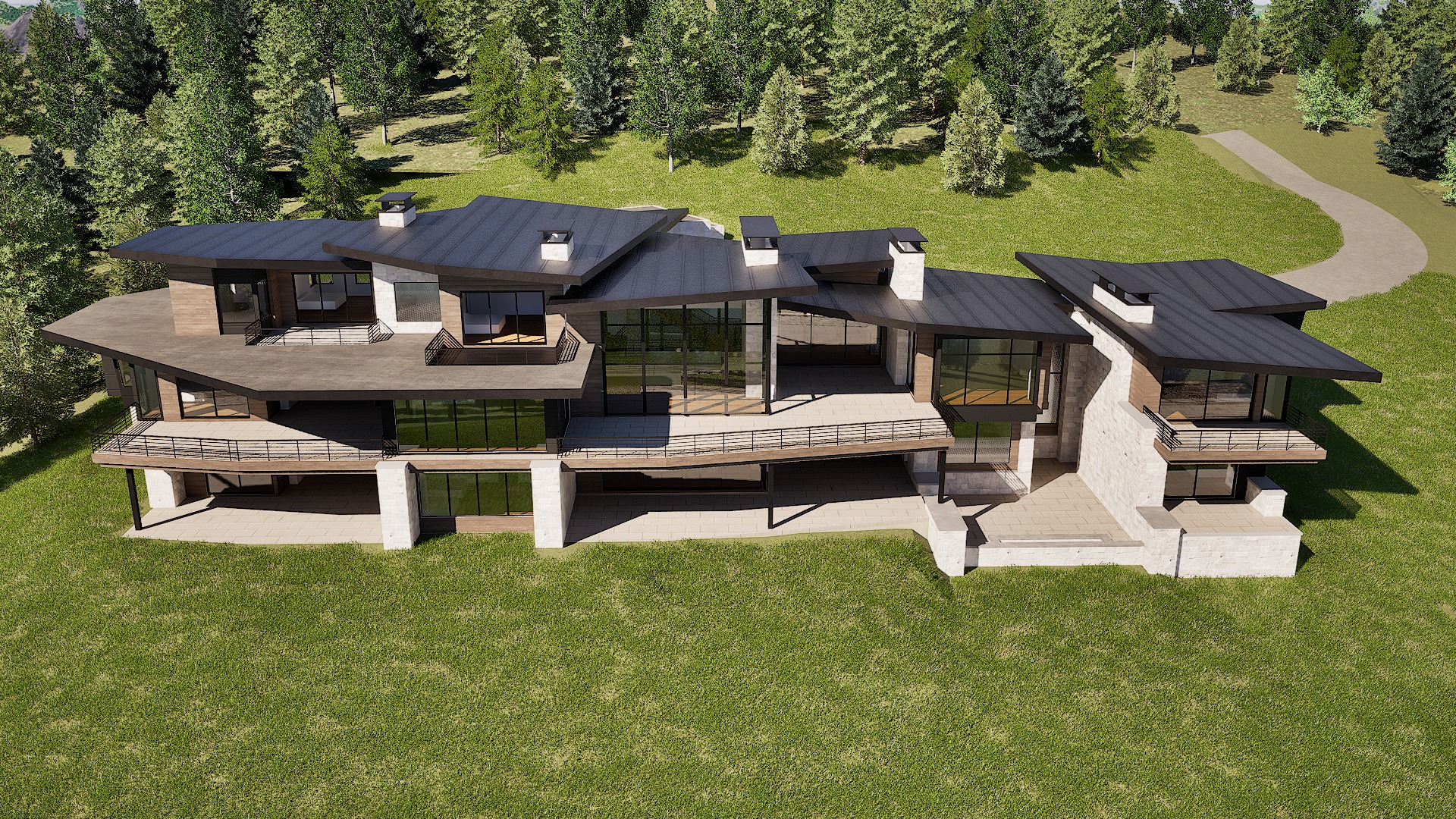 don t change the structure a modern home made from the following materials white stacked stone veneer dull black aluminum acm metal paneling horizontal brown wood siding and a black aluminum metal fascia enhance each of these materials to have more realistic shadows and textures add a dull warm light illuminating from the interior add landscaping and vegetation around the exterior of the home with green bushes tall grass and flower bushes enhance the trees in the background to look more realistic enhance the lawn grass to have a clean cut around the driveway and look more realistic