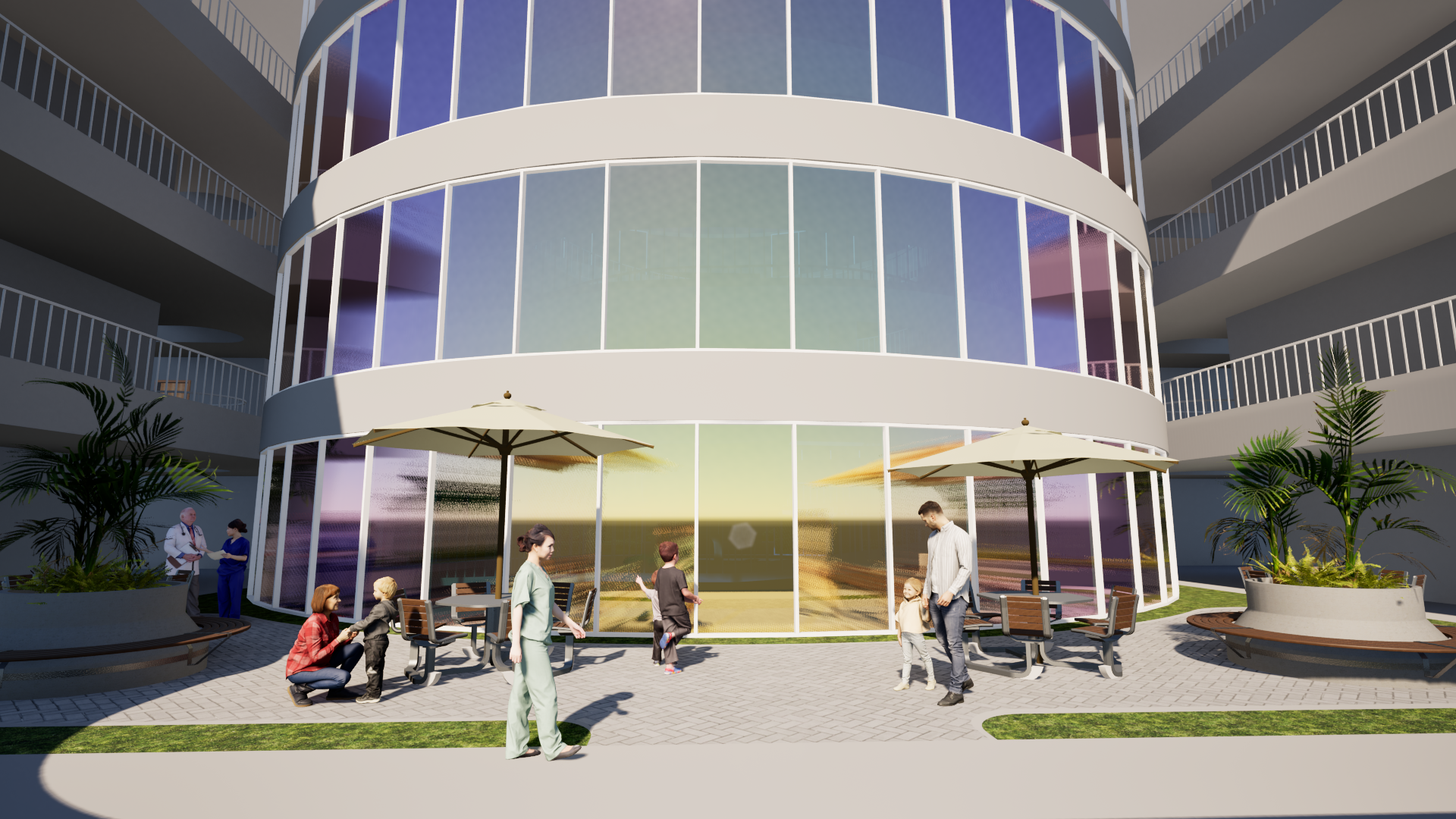 keep the characters and the polychrome glass add greeneries on the grass area make it lively with colorful plants change the pavement colors make it neutral change the material of the walls