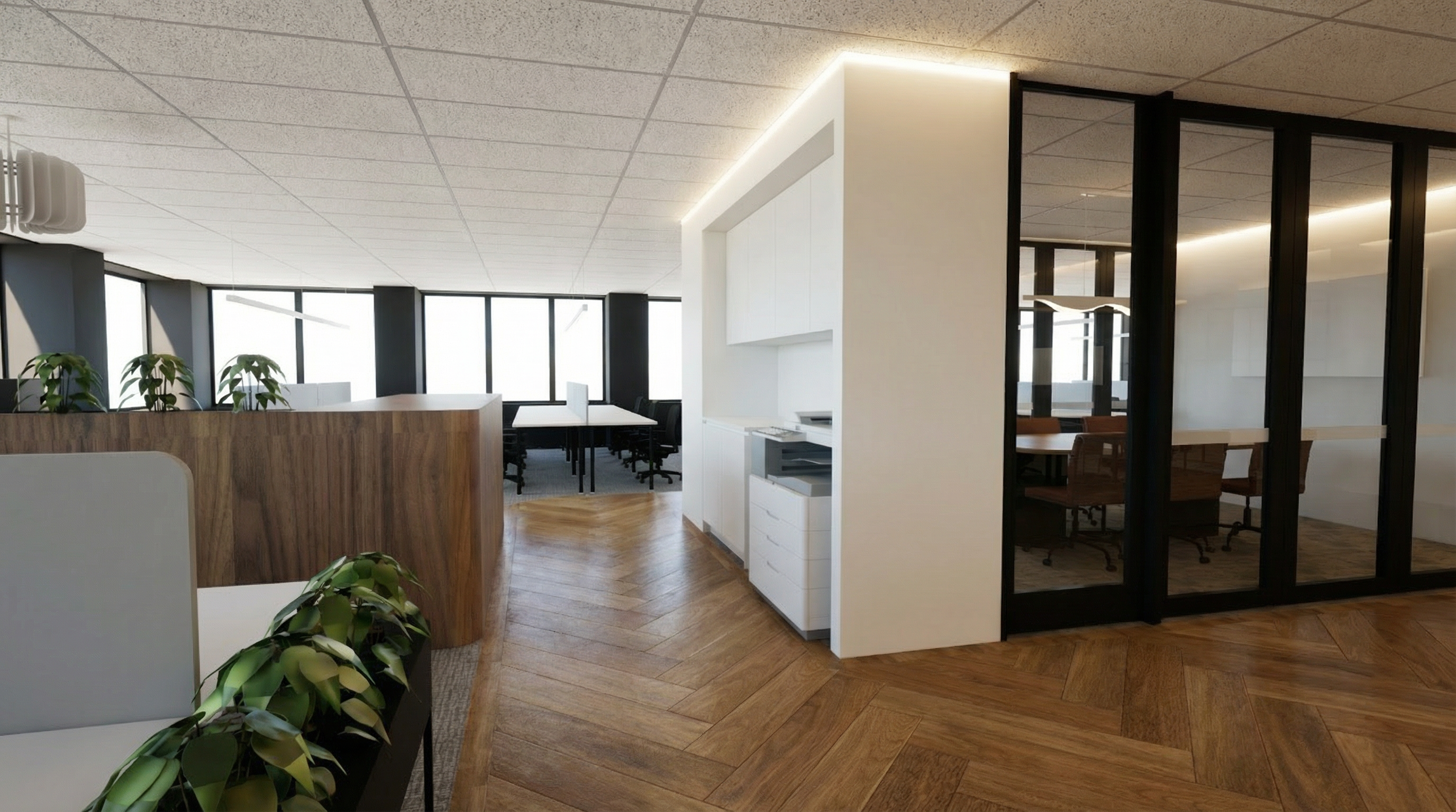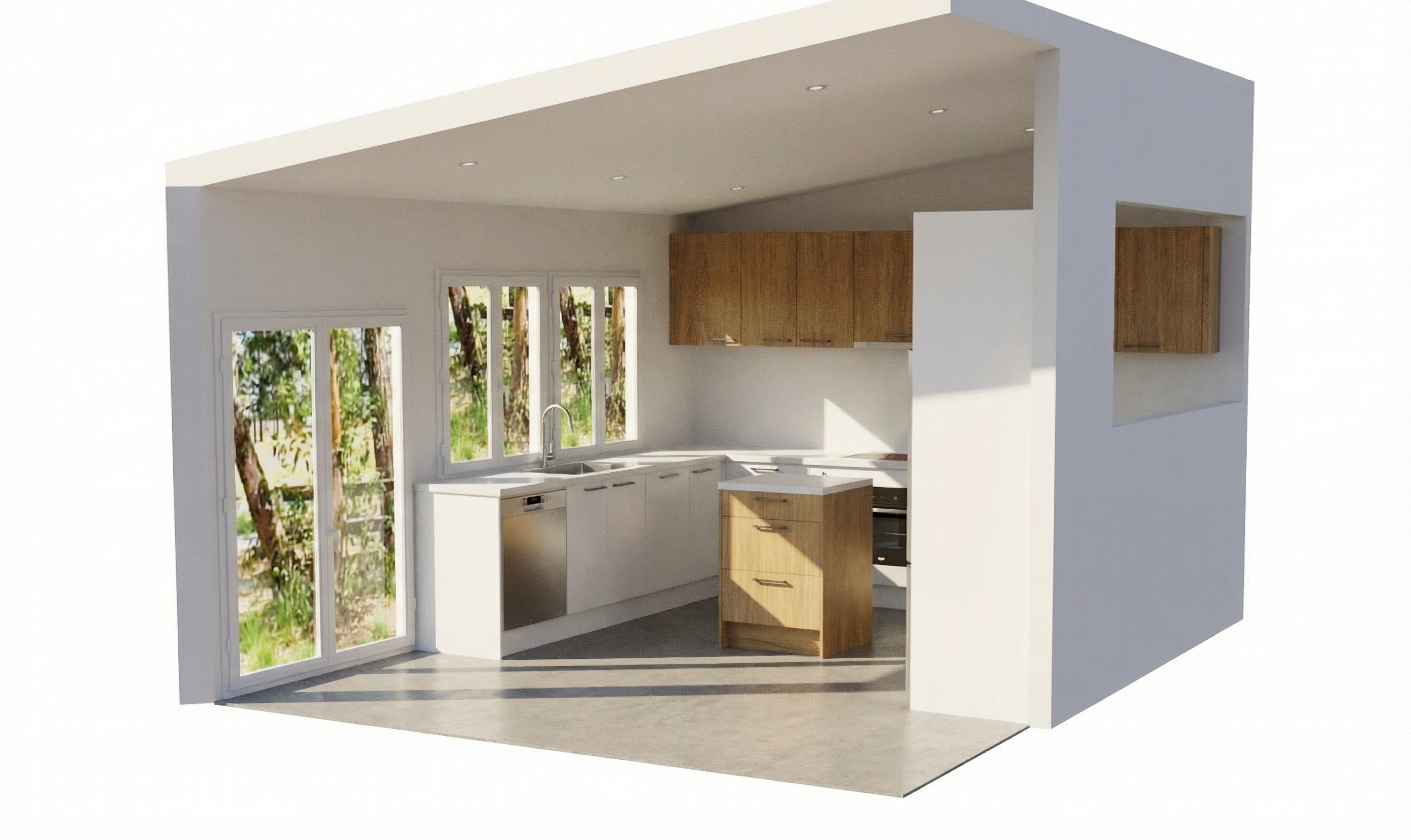 contemporary interior from the top modern farmhouse kitchen white cabinetry black pendant lights light oak wooden flooring minimalist design soft natural lighting clean lines black window frames marble countertop high end finishes realistic interior render architecture