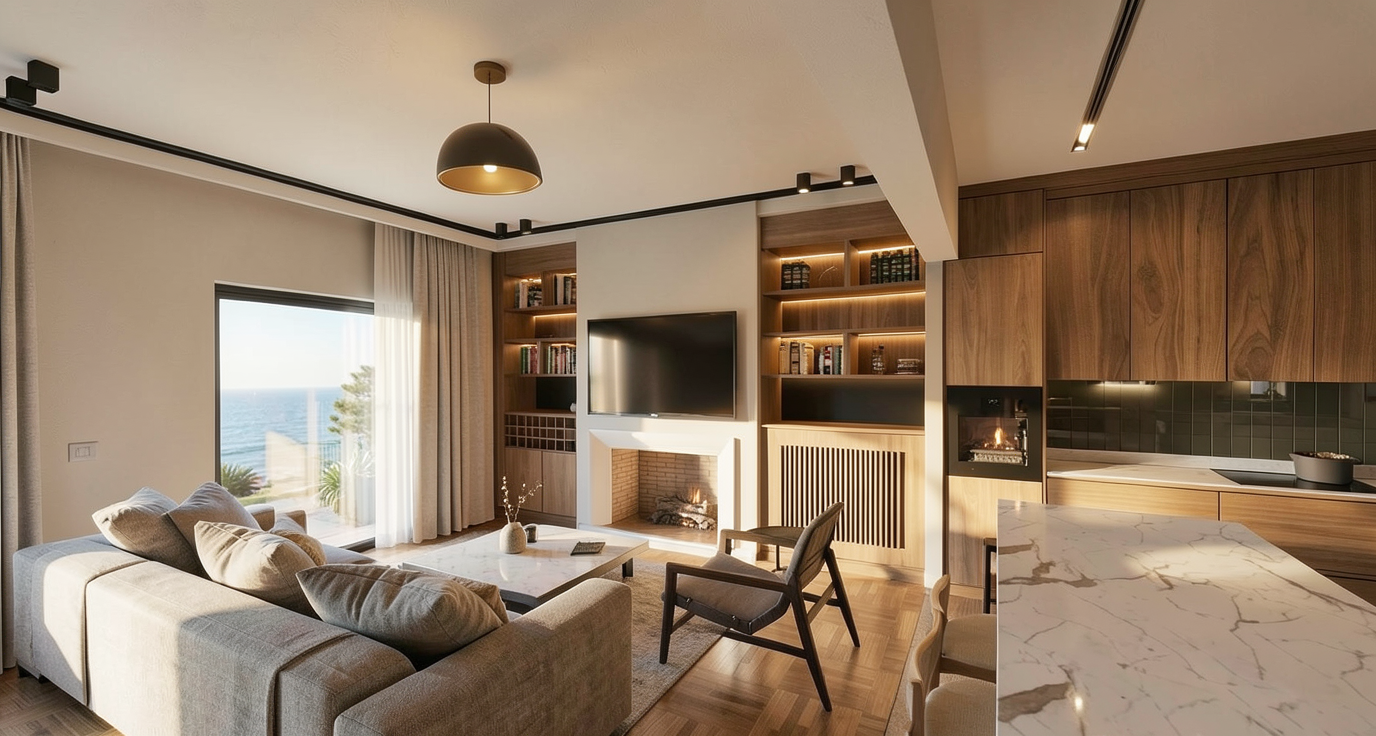 convert this sketchup screenshot into a photorealistic architectural render preserving the geometry nad camera view with natural lighting and high end v ray visualization quality