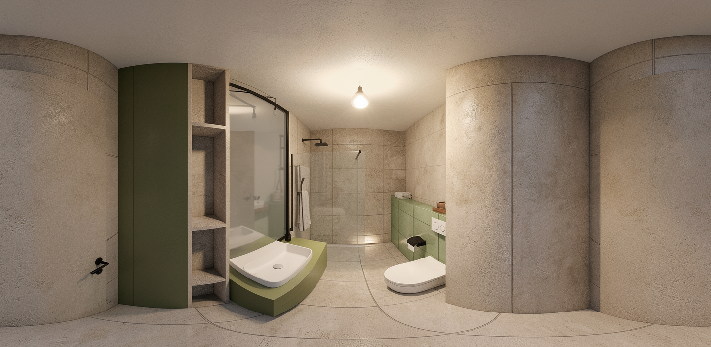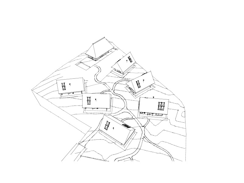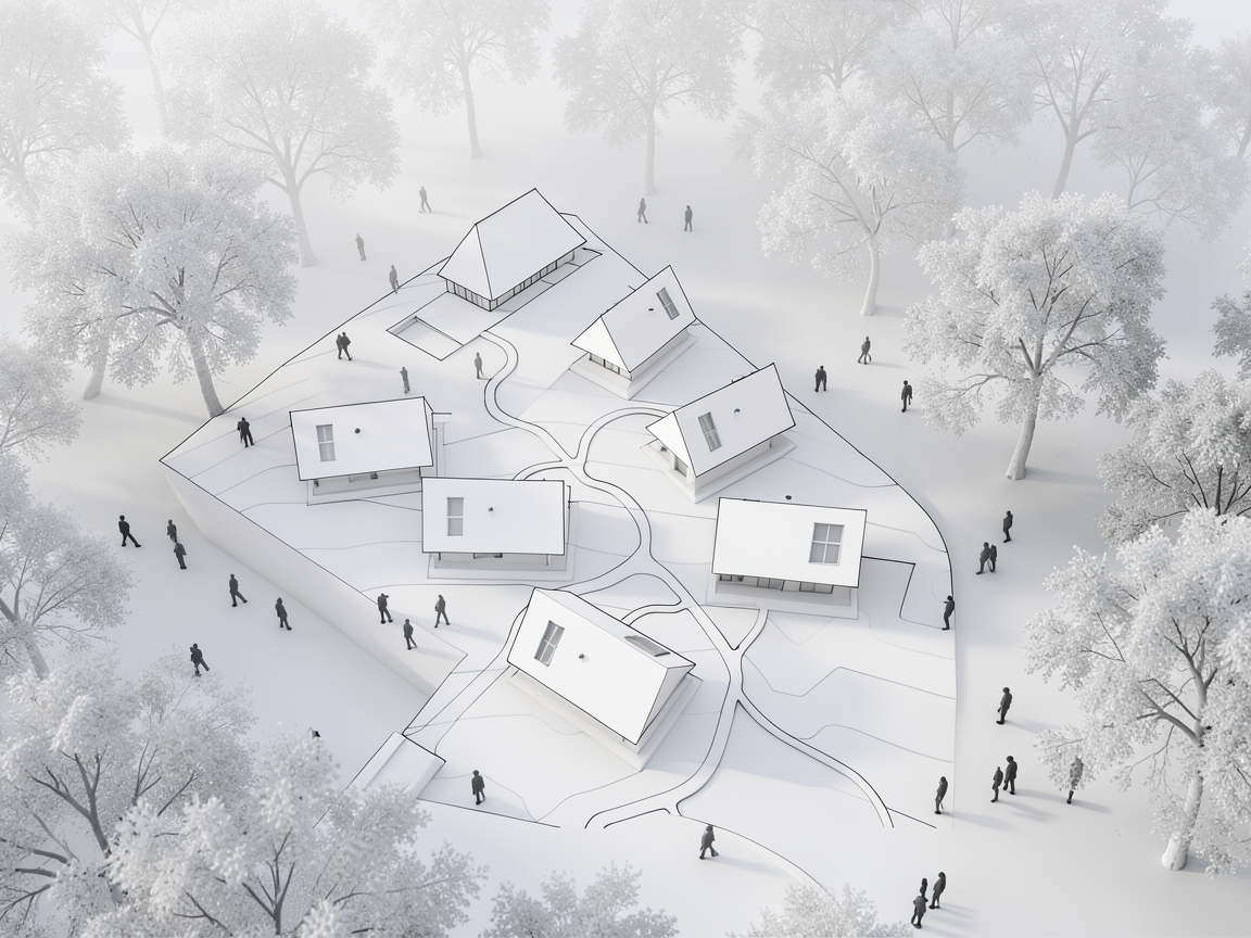 conceptual architectural perspective in monochrome white clay render style soft ambient lighting subtle shadows no realistic materials or colors clean massing model with fine black linework edges minimal detailing smooth white surfaces no textures surrounding landscape with semi transparent light grey transparent trees delicate foliage soft atmospheric depth slightly faded background elements isometric elevated perspective view architectural competition board style high resolution clean composition minimal and elegant presentation