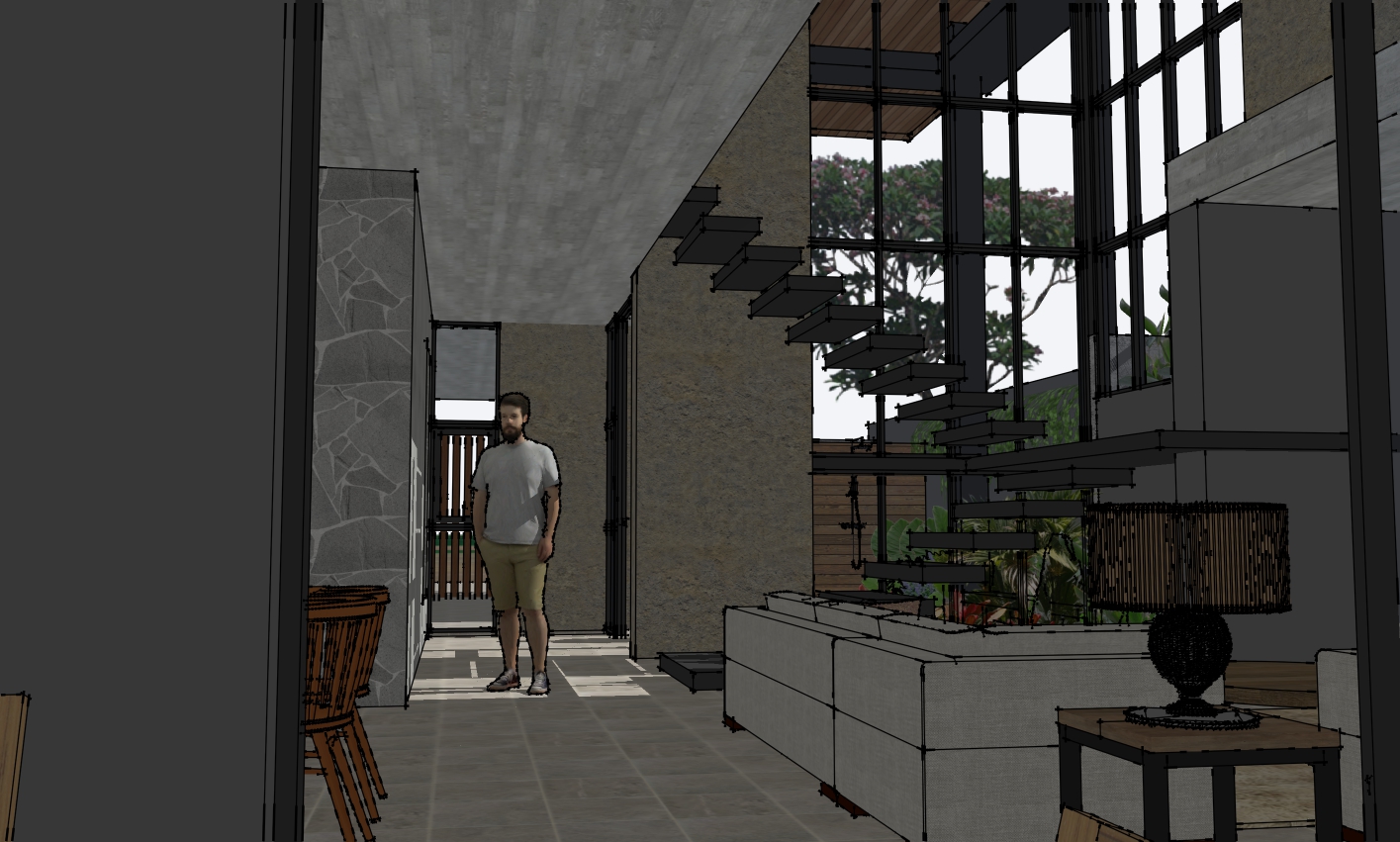 interior shot hyperrealistic render of interior beach front contemporary home with wood stone and earth colored stuccos architecture