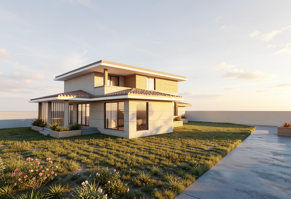 make the entire house stucco add a metal roof add a sliding glass door to the front in proportion to the wall
