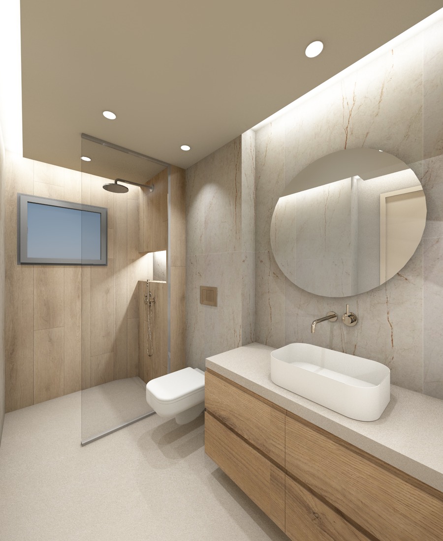 a sleek minimal room featuring the same tiles as previously installed a soft led light glows from behind the round mirror creating subtle ambient illumination chrome faucets and sanitary fixtures complete the clean contemporary look