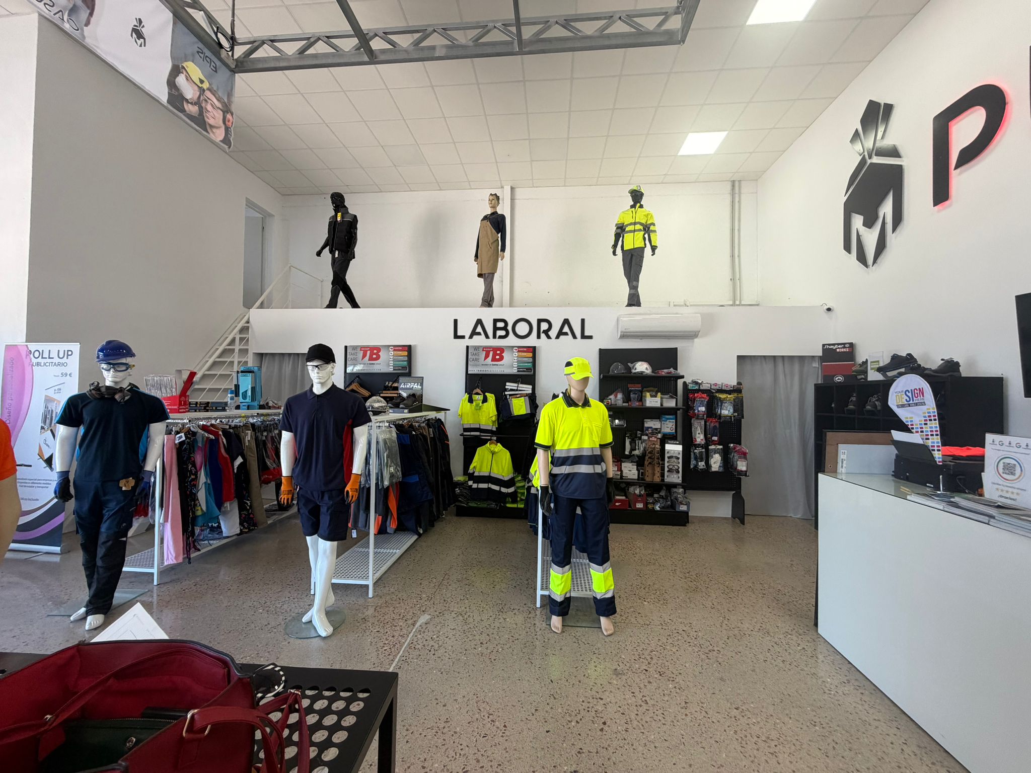 transform this existing clothing store into a modern and attractive retail space specialized in workwear and sportswear maintain the original layout walls ceilings and architectural structure do not modify openings or construction elements replace the current basic white design and simple clothing racks with a more structured and intentional interior design create a strong visual identity combining industrial and contemporary retail design use a balanced mix of materials such as black metal natural wood and textured finishes incorporate organized display systems for workwear and sportswear feature walls with branding or graphic elements functional shelving and integrated hanging systems a more premium and structured layout instead of random racks add focal points to guide customer flow and improve product visibility lighting should be warm and strategic combining general lighting with accent lighting to highlight products color palette neutral base white beige grey with contrasts in black and natural wood tones keep the space realistic functional and suitable for a real retail store avoid empty spaces avoid excessive minimalism and avoid unrealistic design elements
