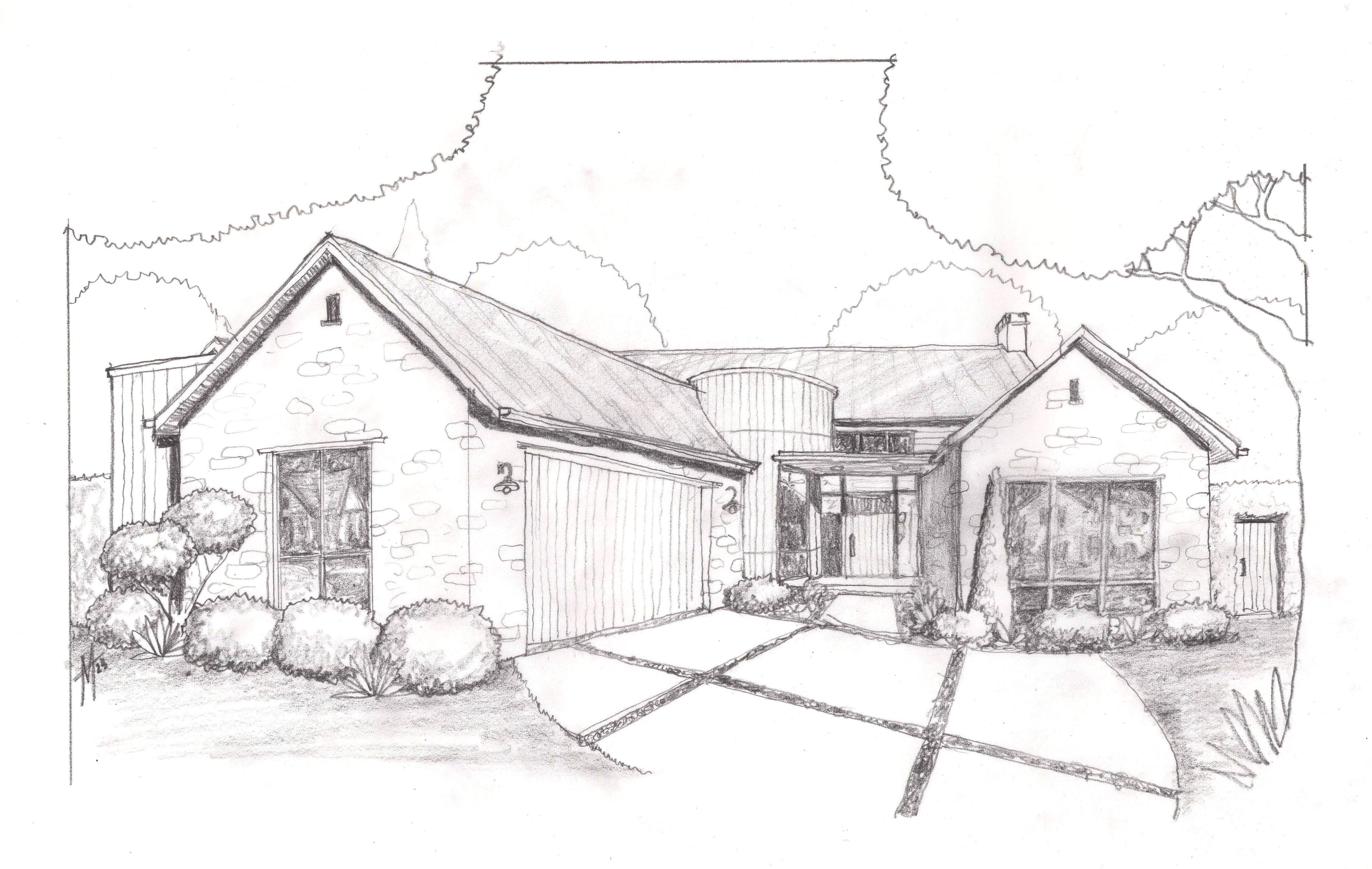 modern farm house walls stone and verticle wood with dark eaves and windows standing seam roof golden hour