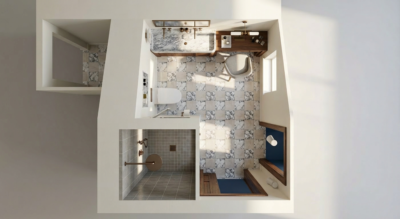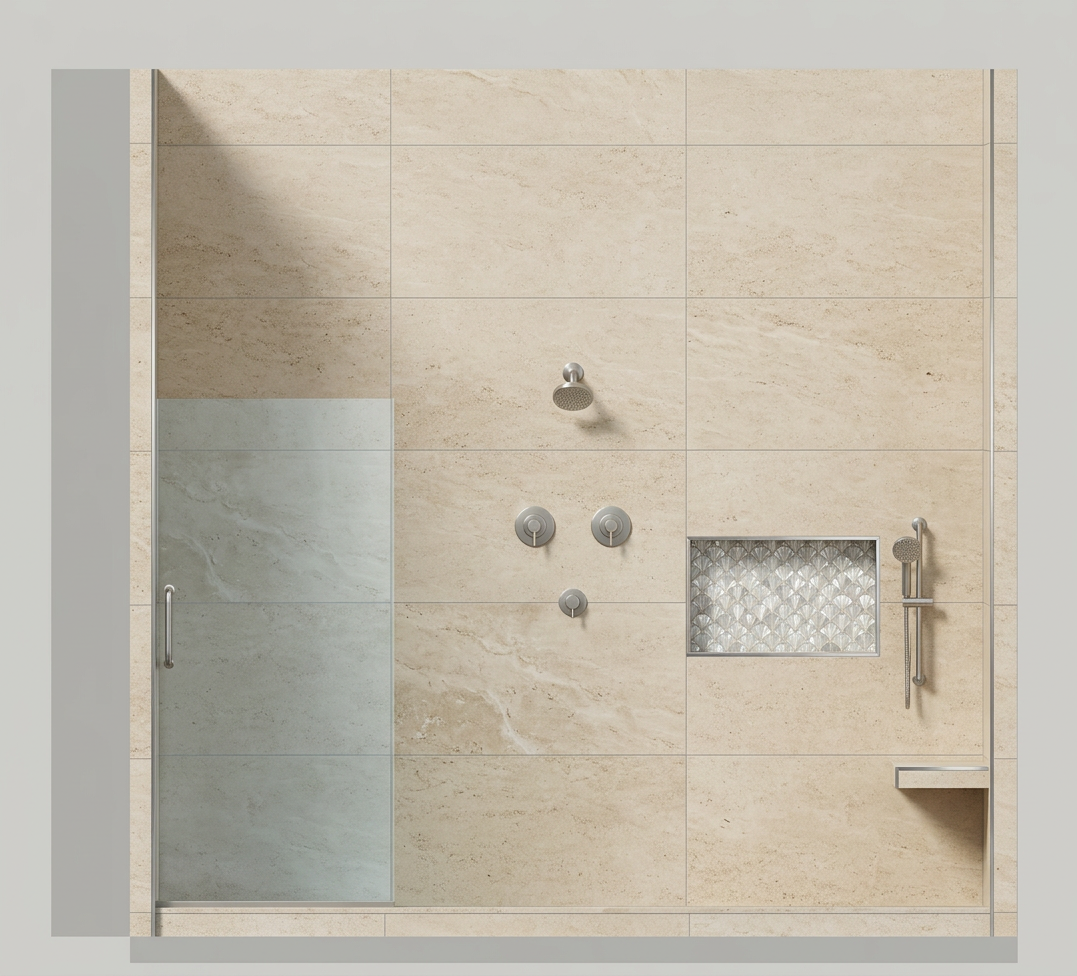 keep everything the same but bring back the small rectangular tiles on the left wall in the same white marble