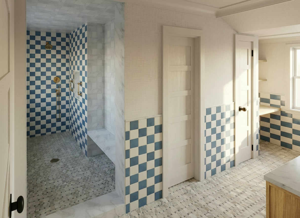 create an hdri photo realistic rendering from my image do not change any image details do not move or modify features keep the colors the same make the rendering photo realistic with 4k resolution add natural sunlight facing cabinetry make wallpaper light grey grasscloth