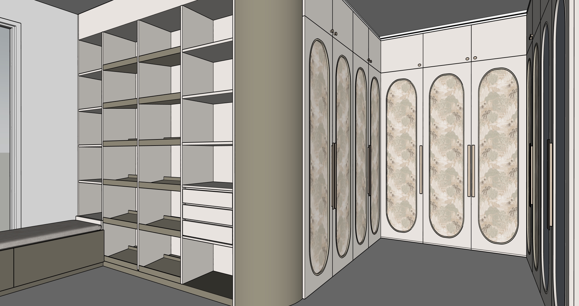 crea una imagen fotorealista a partir de este sketchup realza las texturas e iluminacion es un vestidor y zapataero a ade zapatos y complementos como bolsos en la zona correspondiente de baldas quita las luces de la zona de armarios