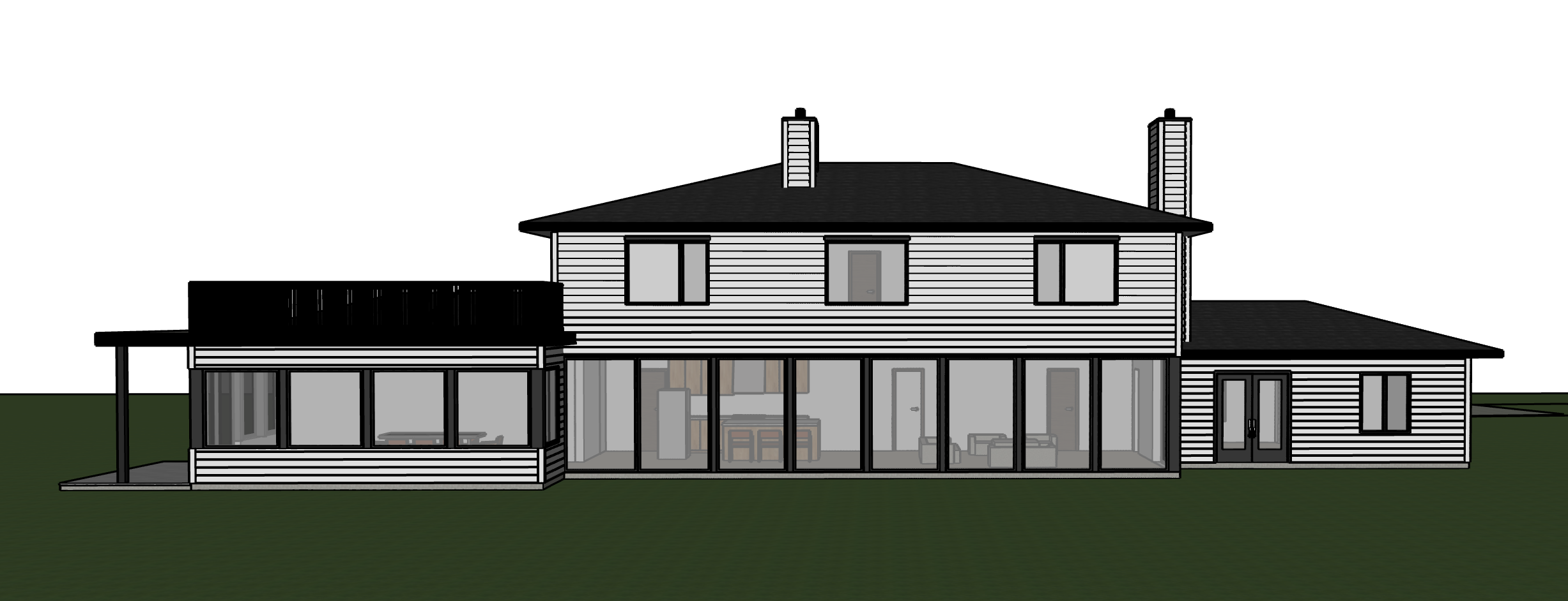watercolour rendering no changes to architecture in image provided white siding for exterior roof are black add some subtle landscaping local to qc forest in background railing in model is black iron rods do not add in any additional railings not already in the model do not add any pathways this is the rear side of the house show grassy yard make windows and glass doors opaque so we don t see inside of house make it so they are not see through make landscape more rocky with gravel in front of floor to ceiling windows not too many large boulders
