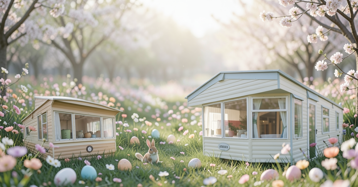create a delicate atmospheric easter scene using the provided mobile houses as the main motif important please keep the houses exactly as they appear in the original photos no color changes no alterations no distortions scene place the houses in a blooming spring setting with delicate flowers and easter eggs add very subtle easter accents eggs hidden in the grass a small bunny elegant and minimalist style cinematic slightly dreamy soft light shallow depth of field photorealistic mood calm fresh hopeful spring awakening restrictions no color changes no fake houses no cartoon elements no strong filters no distortions