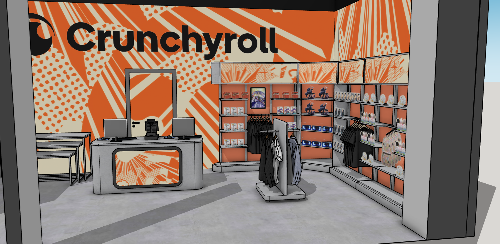 render a vibrant anime merchandise store the walls are adorned with a bold orange and cream pop art design creating a lively atmosphere all retail fixtures and cash register are a brushed silver material and the back of the shelving are a glowing orange through frosted acrylic there is undershelf lighting in a warm orange glow the screens on top of the shelving and the front of the cash register are tv s with the same imagery as the back wall the floor is a dark grey stained concrete shelves are filled with colorful figurines and collectibles while neatly arranged clothing hangers display stylish anime themed apparel in black and gray the countertops are sleek with modern laptops and a black cash register the store gives a futuristic yet inviting ambiance combining a concrete textured floor with clean sharp lines and strong lighting that accentuates the bright and varied merchandise creating an energetic and exciting shopping environment