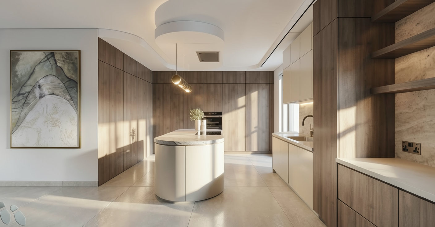 enhance this architectural interior image to a highly photorealistic render while preserving the exact composition of the original image strict instructions maintain the exact geometry camera angle layout and proportions from the reference image do not move remove or add any furniture objects or architectural elements do not modify the lighting layout or light sources preserve the same warm ambient lighting improving it to look natural and realistic 3000k warm interior light scene description a mid century inspired open kitchen and dining space inside a renovated apartment the space contains a central kitchen island with integrated cooktop three wooden bar stools a long minimalist kitchen counter with built in oven column a large wooden dining table with chairs mid century style lighting fixtures and furniture a checkered red and beige kitchen floor wooden parquet flooring in the dining area neutral warm walls material instructions the kitchen countertop and island must keep the material nara by cosentino with realistic stone texture subtle grain and soft reflections cabinetry should remain matte off white the dining table and stools should show natural wood grain maintain the mid century aesthetic of the furniture and lighting exterior view through the windows and balcony doors show a realistic view of the eixample district of barcelona with classic eixample residential buildings balconies with iron railings and warm mediterranean daylight lighting realism warm architectural interior lighting soft shadows global illumination natural daylight entering through the windows cinematic interior photography look rendering style photorealistic architectural visualization ultra realistic materials ray tracing global illumination interior photography high detail textures natural color grading 8k negative prompt important no layout change no moved furniture no extra furniture no different materials no altered lighting positions no new windows or doors no distorted architecture
