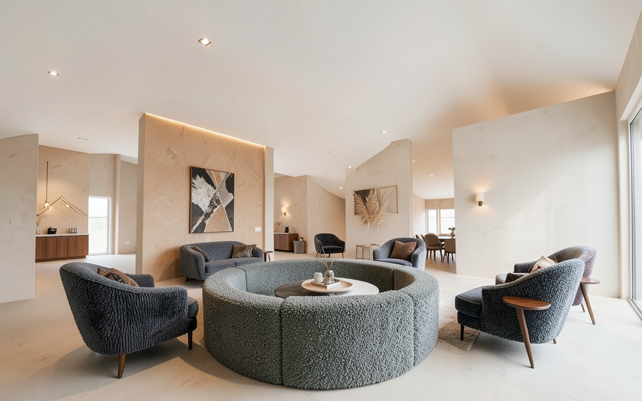 exterior shot can you please render this image into a contemporary architectural pod with a unified aerospace inspired material language side facades feature a textured surface that abstractly reflects wind flow and aerodynamic patterns inspired by airflow simulations not literal graphics the texture feels lightweight engineered and fluid the front facade is composed of clear high performance glass curtain walls with minimal mullions
