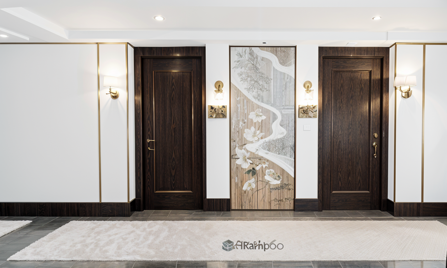 white flat panel cuboards evening sun coming in through window light oak timber flooring tv hung on wall above cabinet handles to be shell or half moon handles centre top of doors