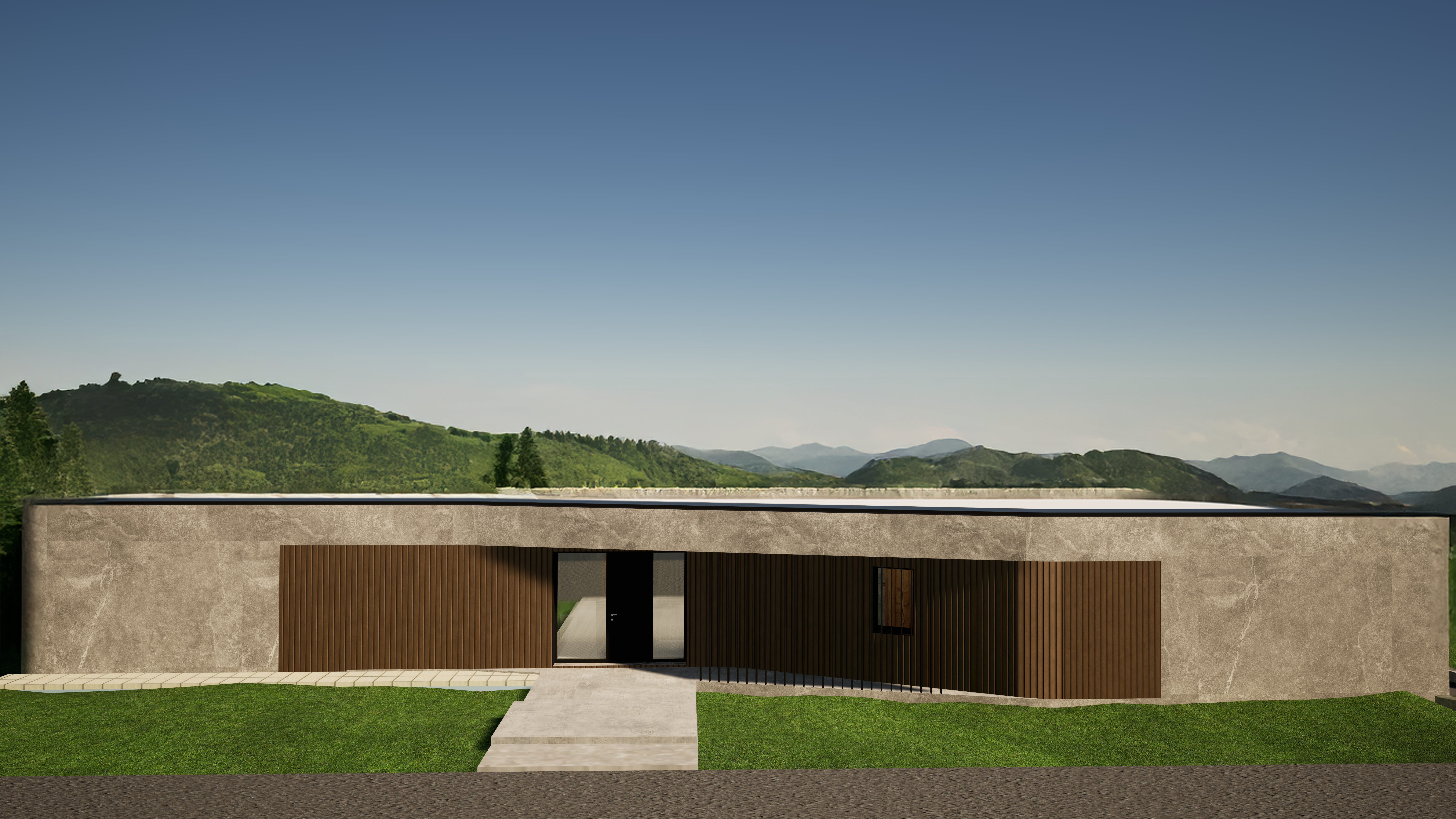 replace the wooden cladding with photorealistic vertical slatted wood in a natural color showing visible grain and subtle variations replace the existing stone walls with large rock panels that closely mimic the current stone texture the panels should preserve the look and character of the original rock replace the background with a neutral minimal one soft grey or white to highlight the architecture ensure high resolution photorealistic architectural quality