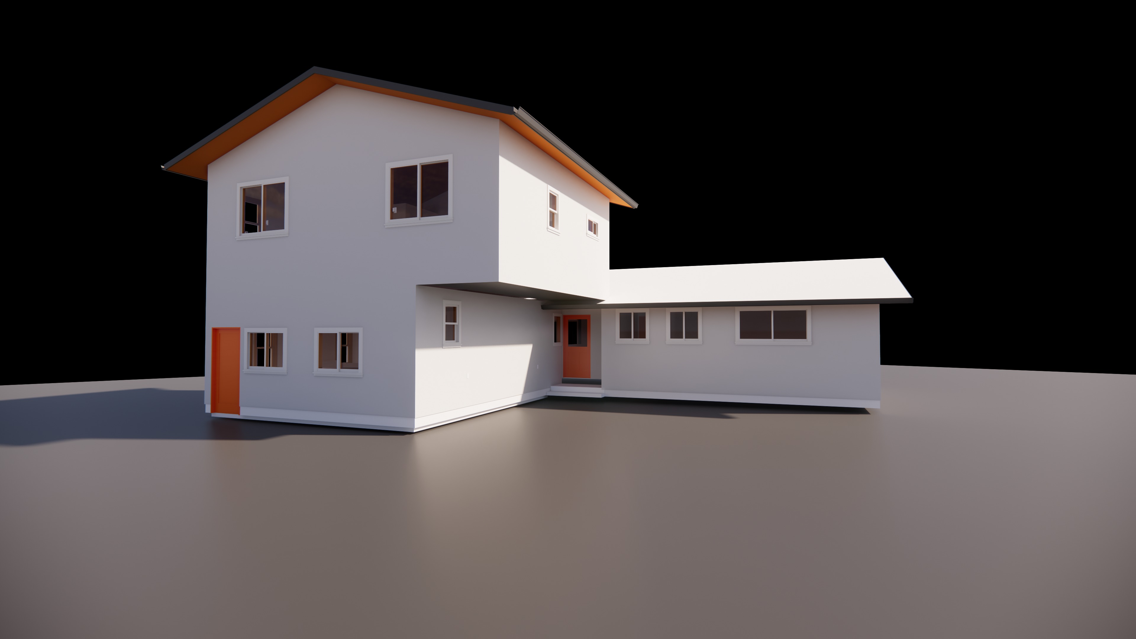 paint the house with a worm color keep white window and door trims make doors dark brown add a beautiful low planting where the gravel is on the left side of the image