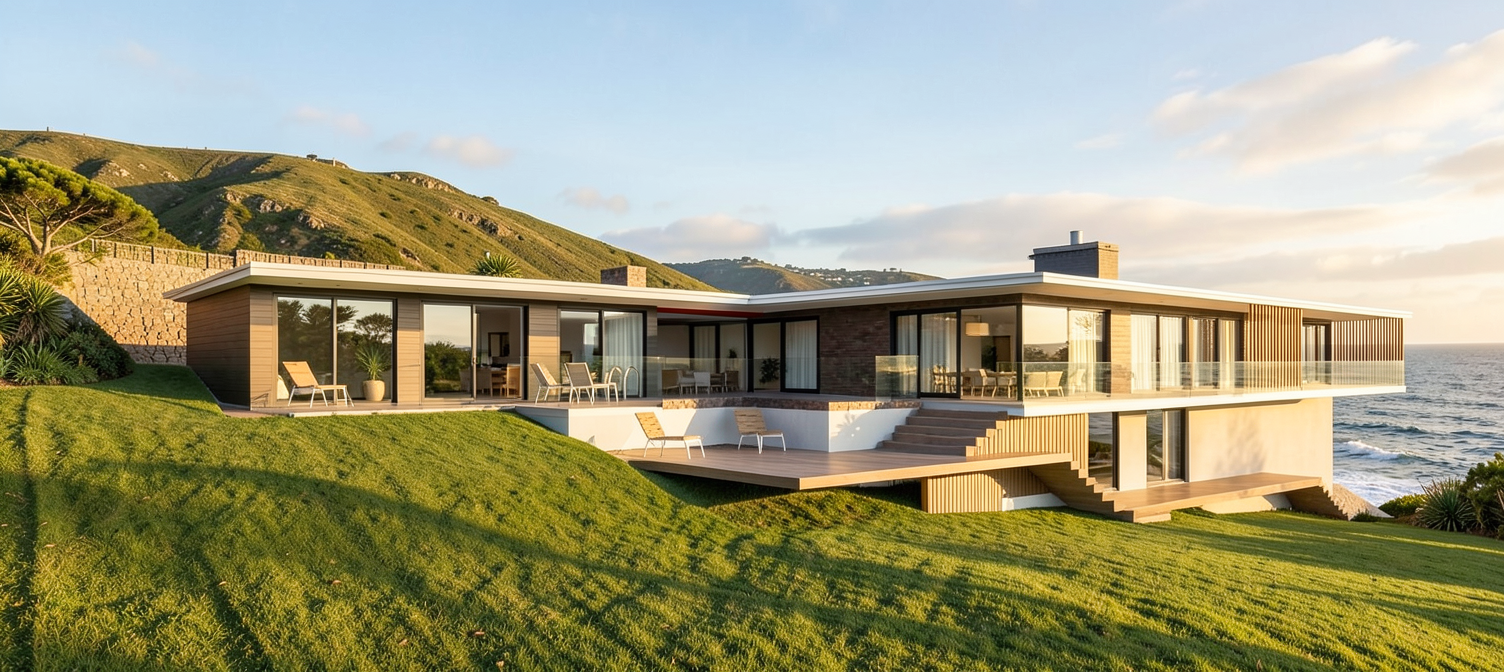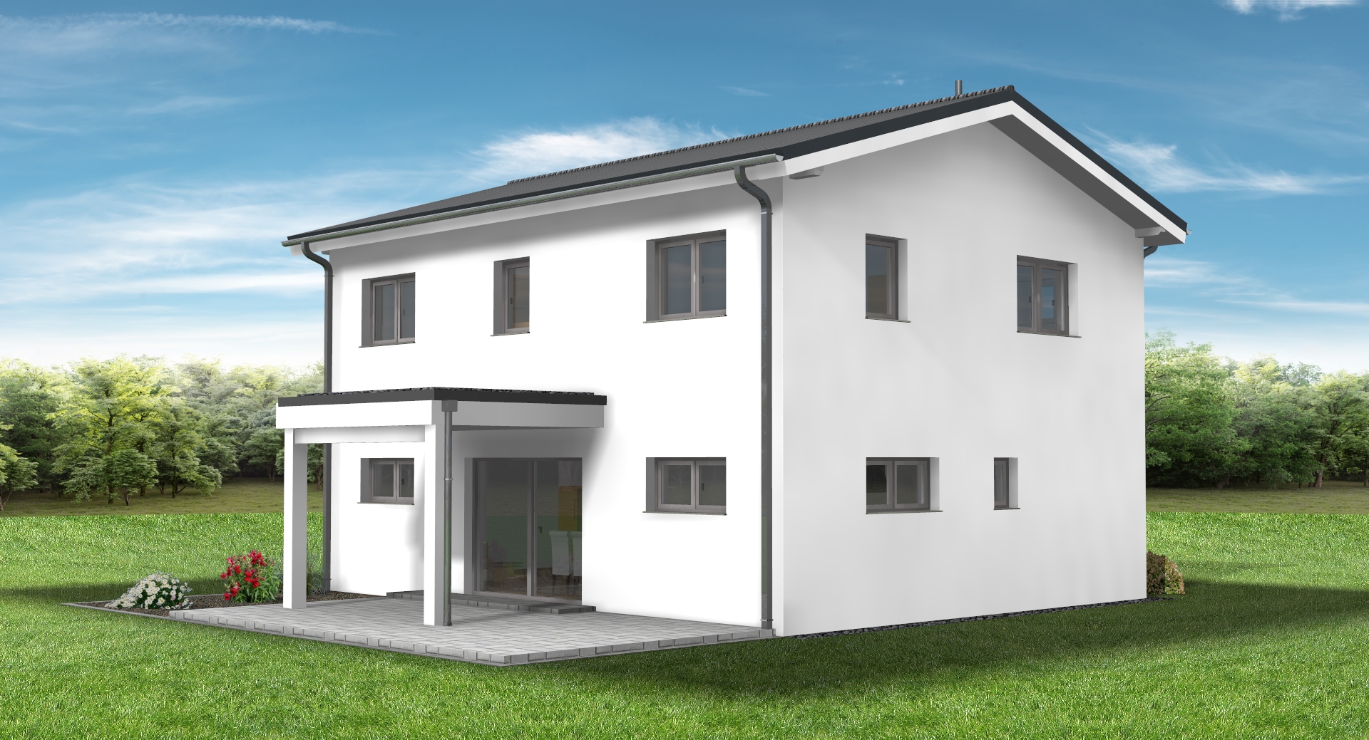 erstelle f r exakt dieses haus eine realistische au enansicht dach anthrazit fassade wei fenster und haust re hellgrau das haus soll in einem dezent modernen garten situiert sein behalte alle ma e und farben des hauses exakt bei
