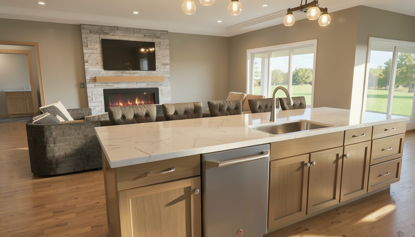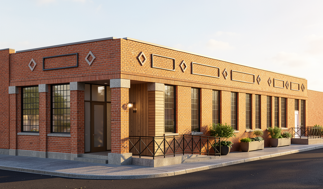 render with orange red brick add realism add plants in existing planters on right side use wood look siding at entry wall to the right of the door show entry as all storefront show railing as black show decorative elements at the top of building as brick also render with light source from the top left show brick at second column feature from the corner