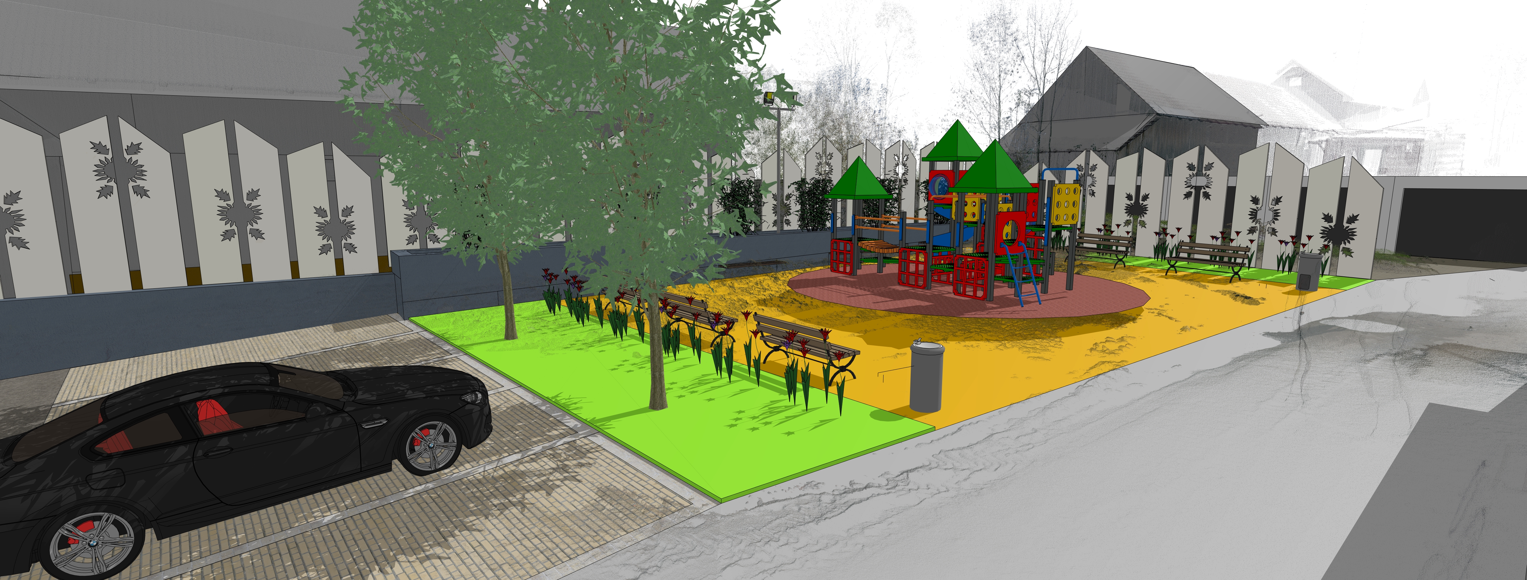 vyrendruj to v realnom prevedeni zachovaj oranzovu plochu ako dopadovu plochu ihriska a dopln ludi deti a kvety v zeleni