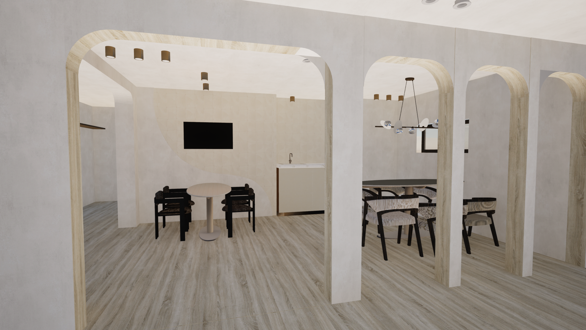enhance the materials and textures that are used in the design improve natural look of light oak wood flooring add led strips along the curved wall elements improve overall lighting add same wood in the roundings of the arches as on the flooring
