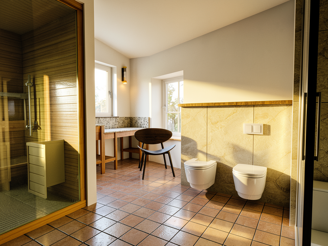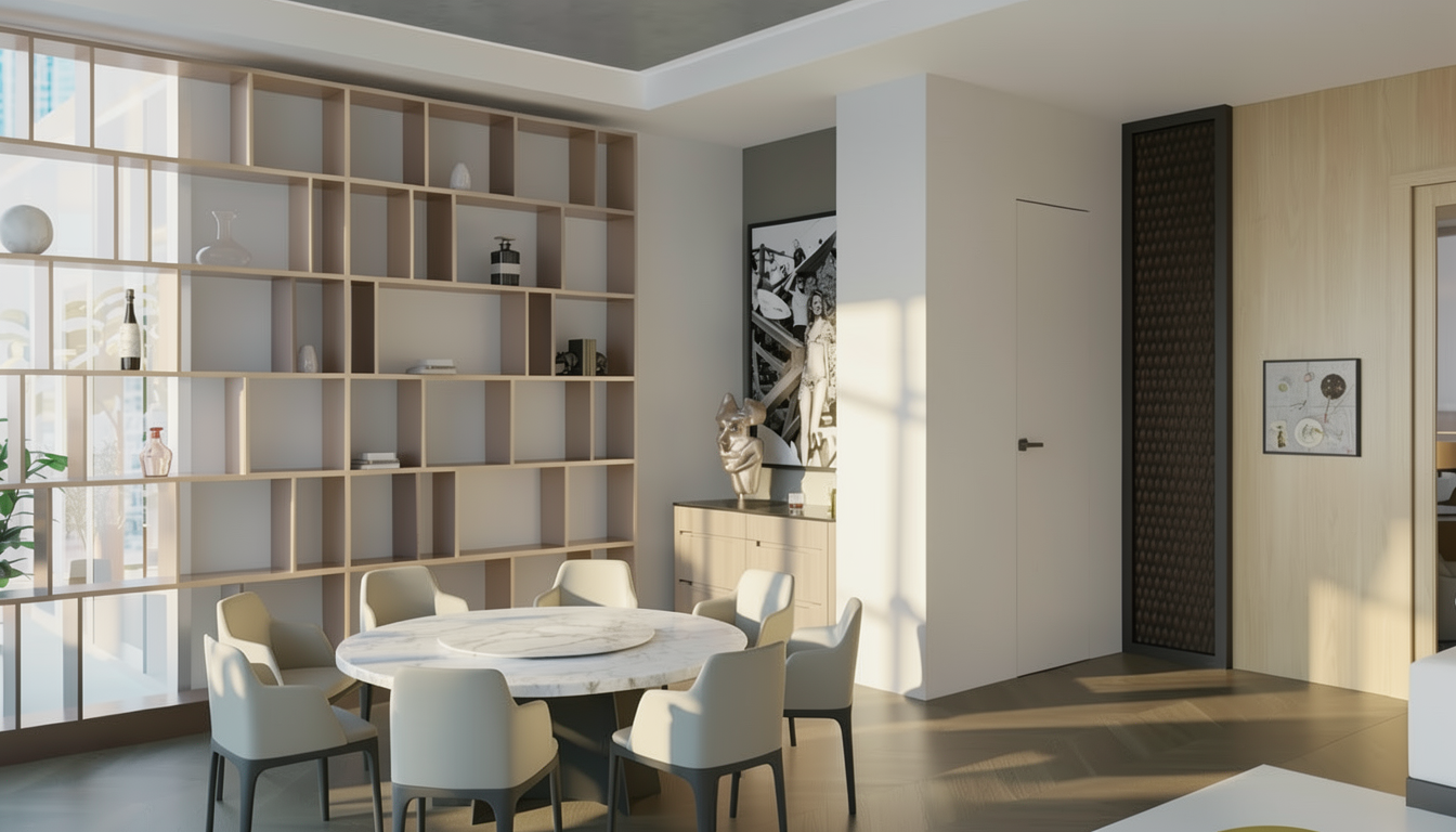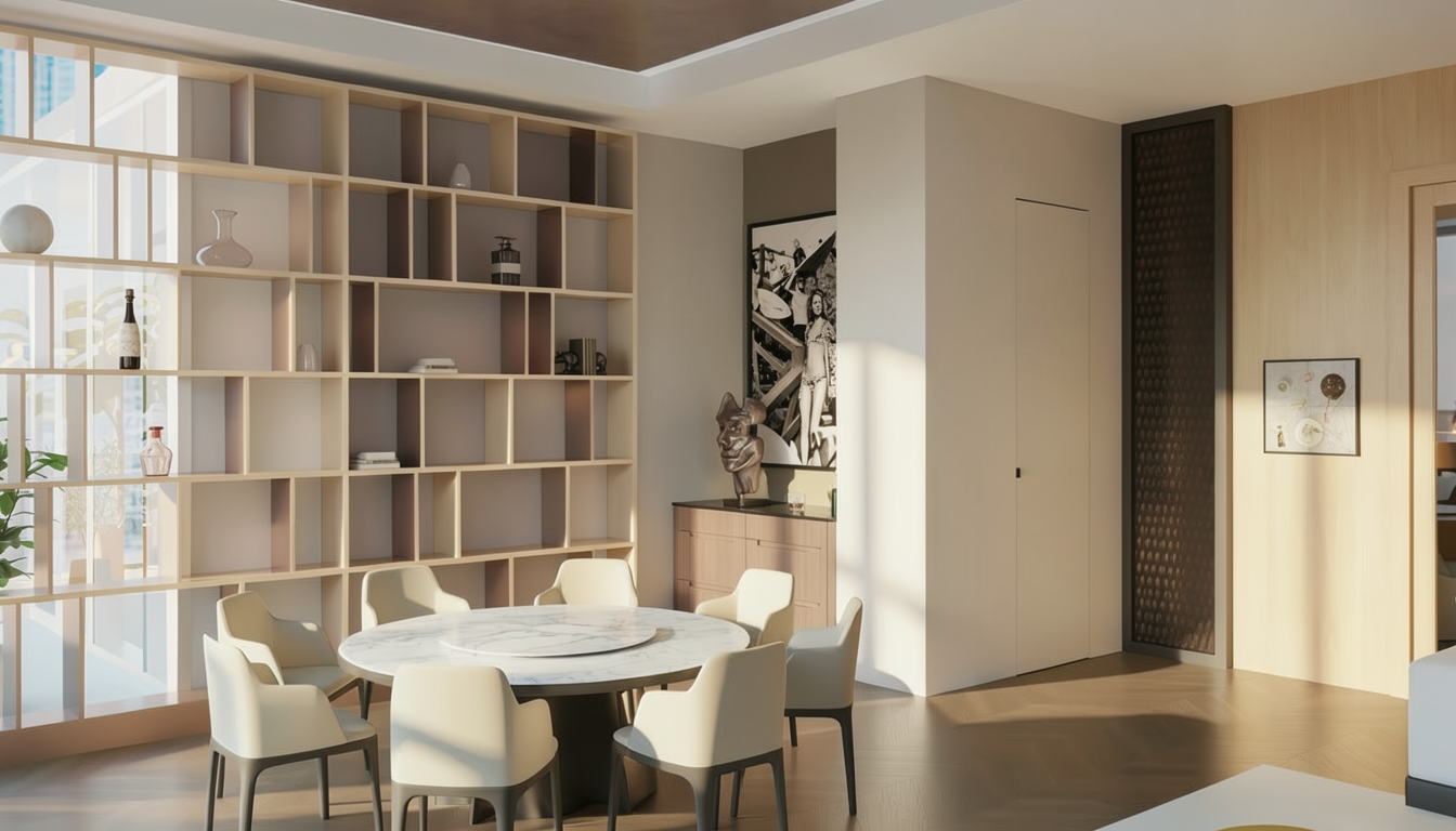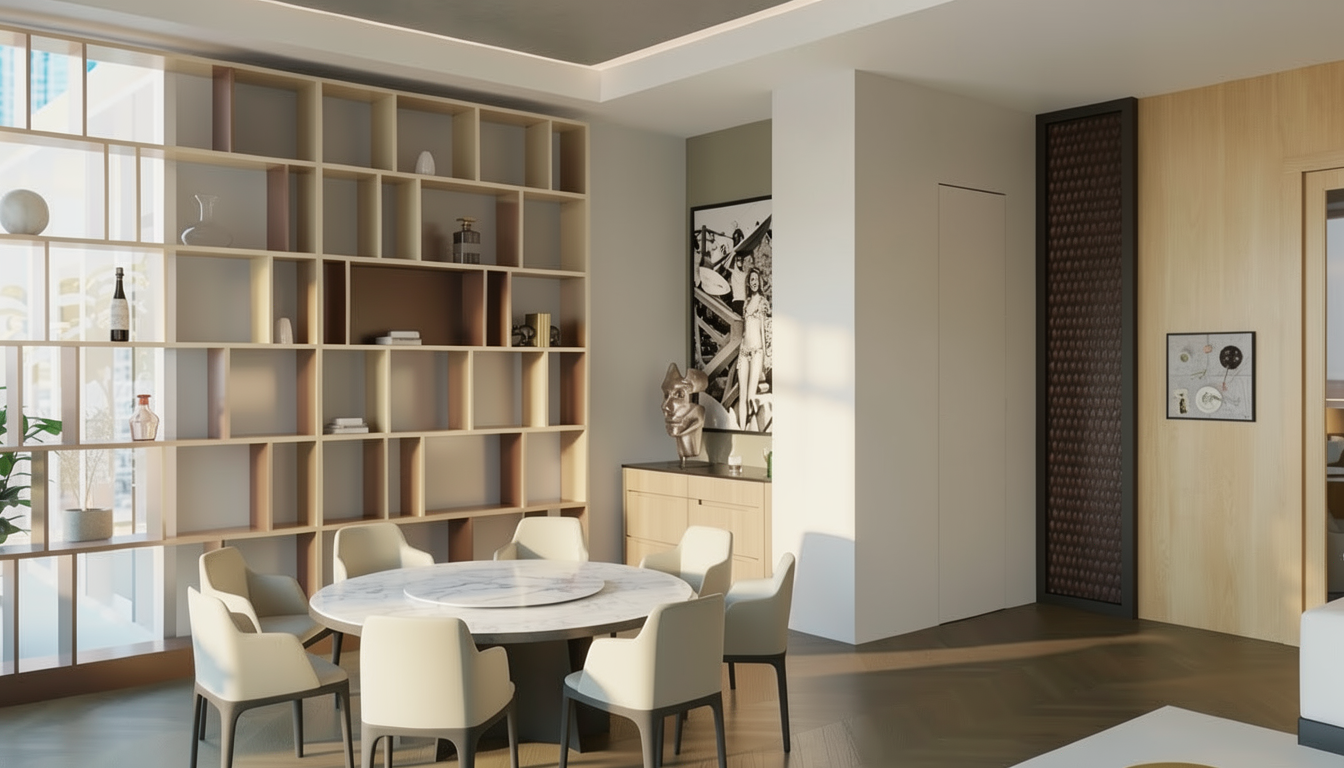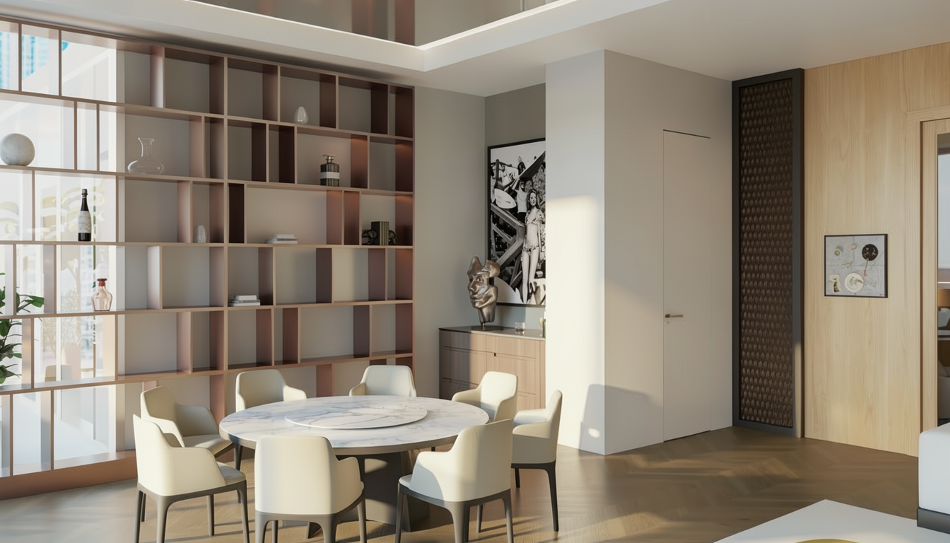 don t add door handle to door modern dining room minimalist design featuring a round marble table with soft white and gray veining surrounded by elegant off white chairs with dark gray legs the back wall showcases a sophisticated open shelf in light beige metal fatina smoky bronze red dark brown to the right a wooden paneled wall in light maple complements the room with a subtle abstract painting framed in black warm natural light filters through large windows casting soft shadows for a serene and inviting atmosphere