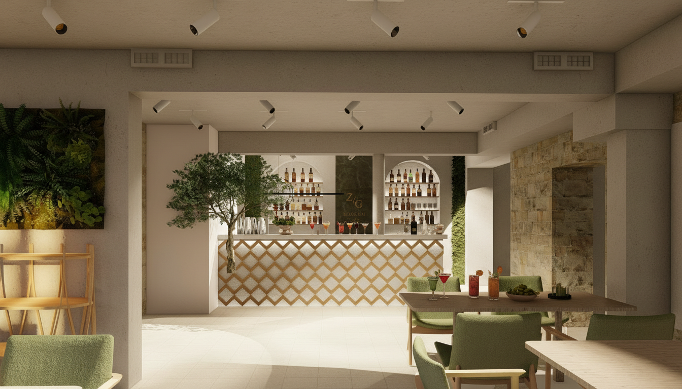 keep everything in the scene exactly the same geometry layout materials and camera angle add hanging plants falling softly from the ceiling to create a mediterranean atmosphere