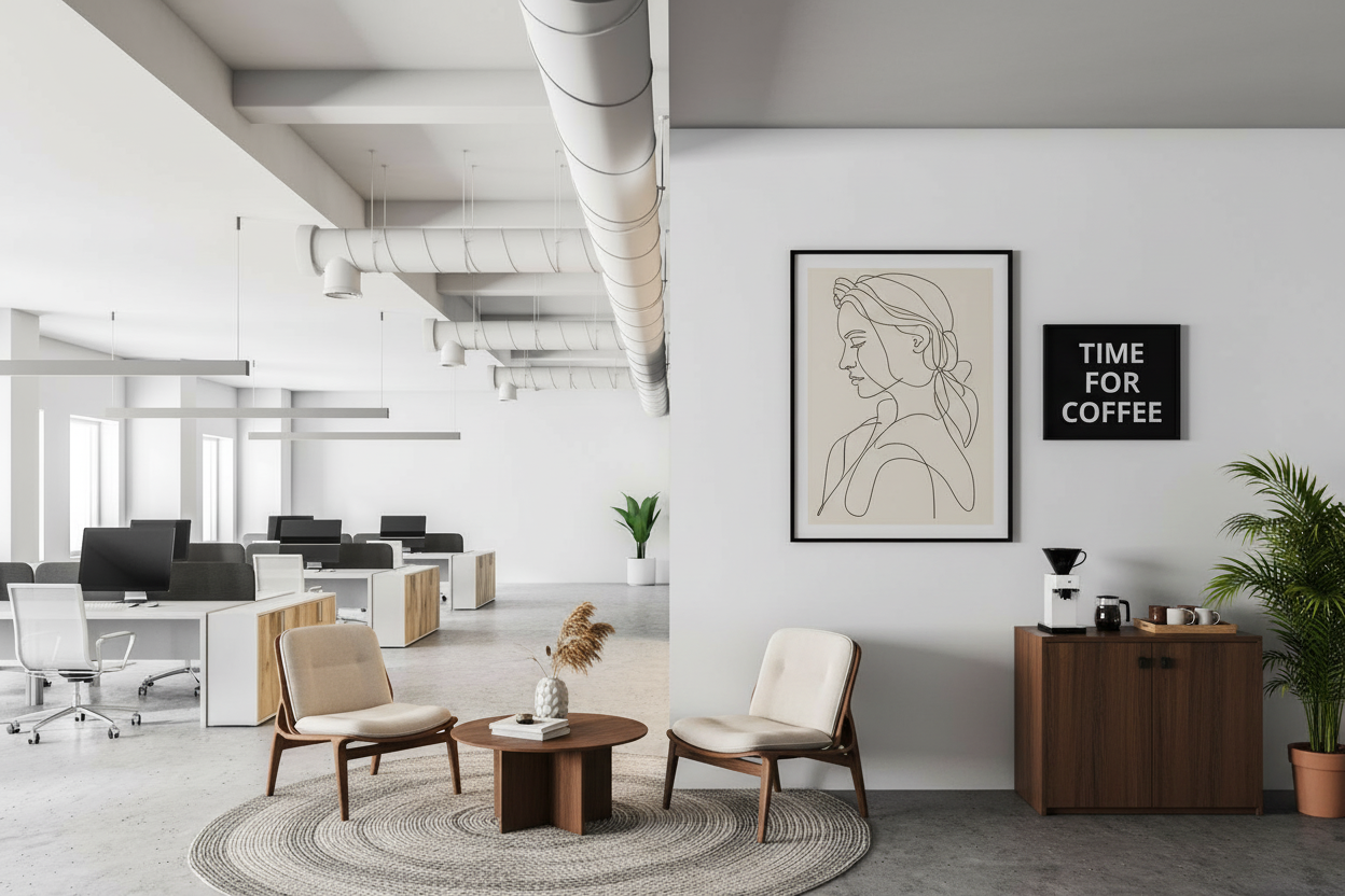 a small and cozy social zone in a scandinavian style office interior a seating area with two sculptural chair in warm wood a low warm wood coffee table a round rug art on the wall green plants art sign on wall that says time for coffee calm scandinavian color palette with warm neutrals dark wood and soft textures