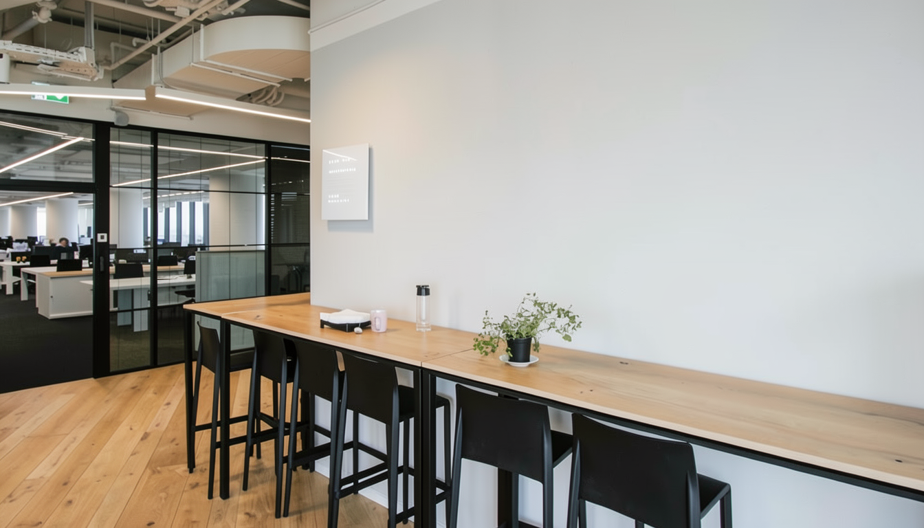 modern open concept office space en coffee corner include a wavy dark black conference table surrounded by modern beige wallnut stools large windows allow natural light casting soft shadows on warm beige carpets use subtle white colored walls to enhance the spacious feeling terracotta orange liughting above the table