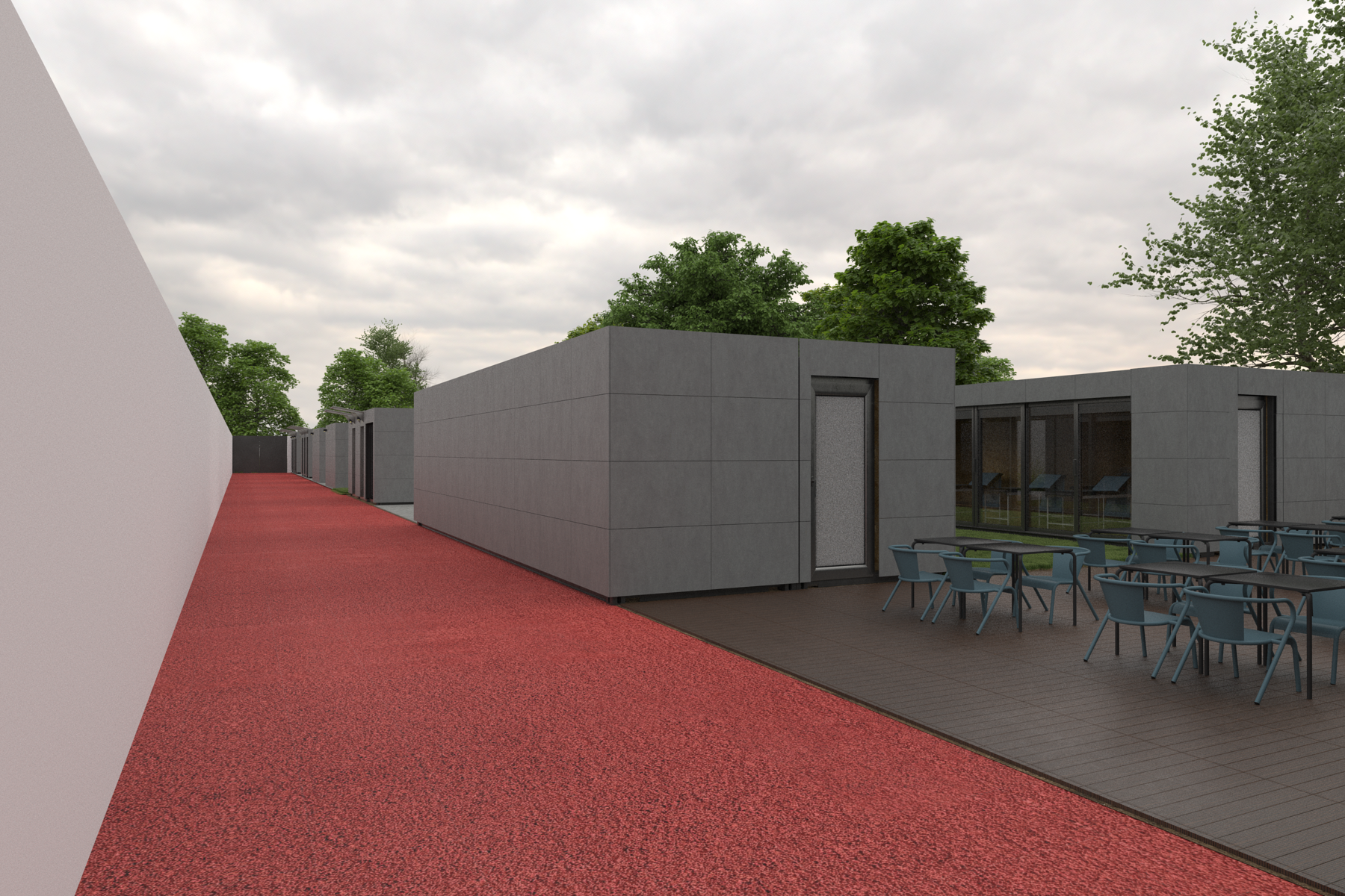 criar um render super realista apenas aperfei oar os materiais e ilumina o colocar ilumina o dentro dos contentores colocar pessoas nas cadeiras e no fundo do pavimento vermelho