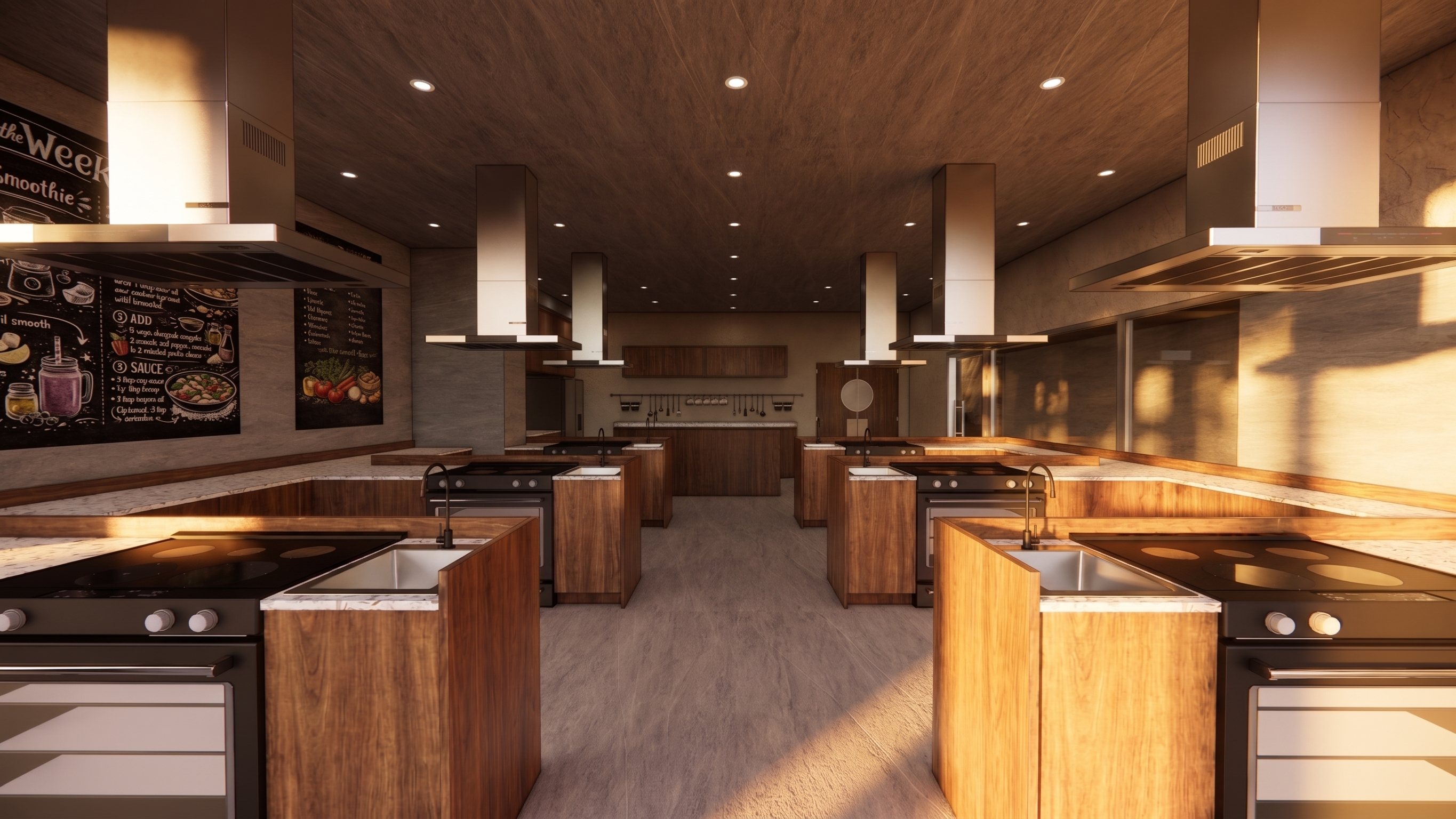 soft white modern kitchen kitchen realistic render high detailed add kitchen accesories black frame of the glass cabinets glass inner shelves mirror on the end of glass cabinets add e soft rug under the dinning table