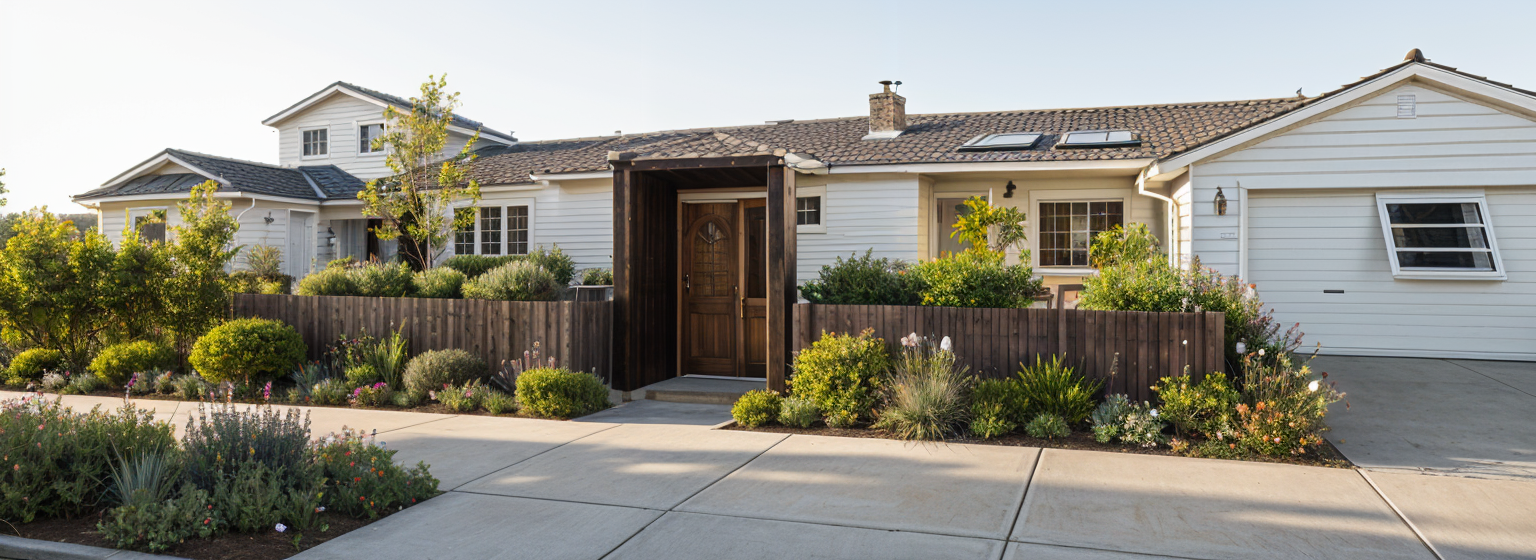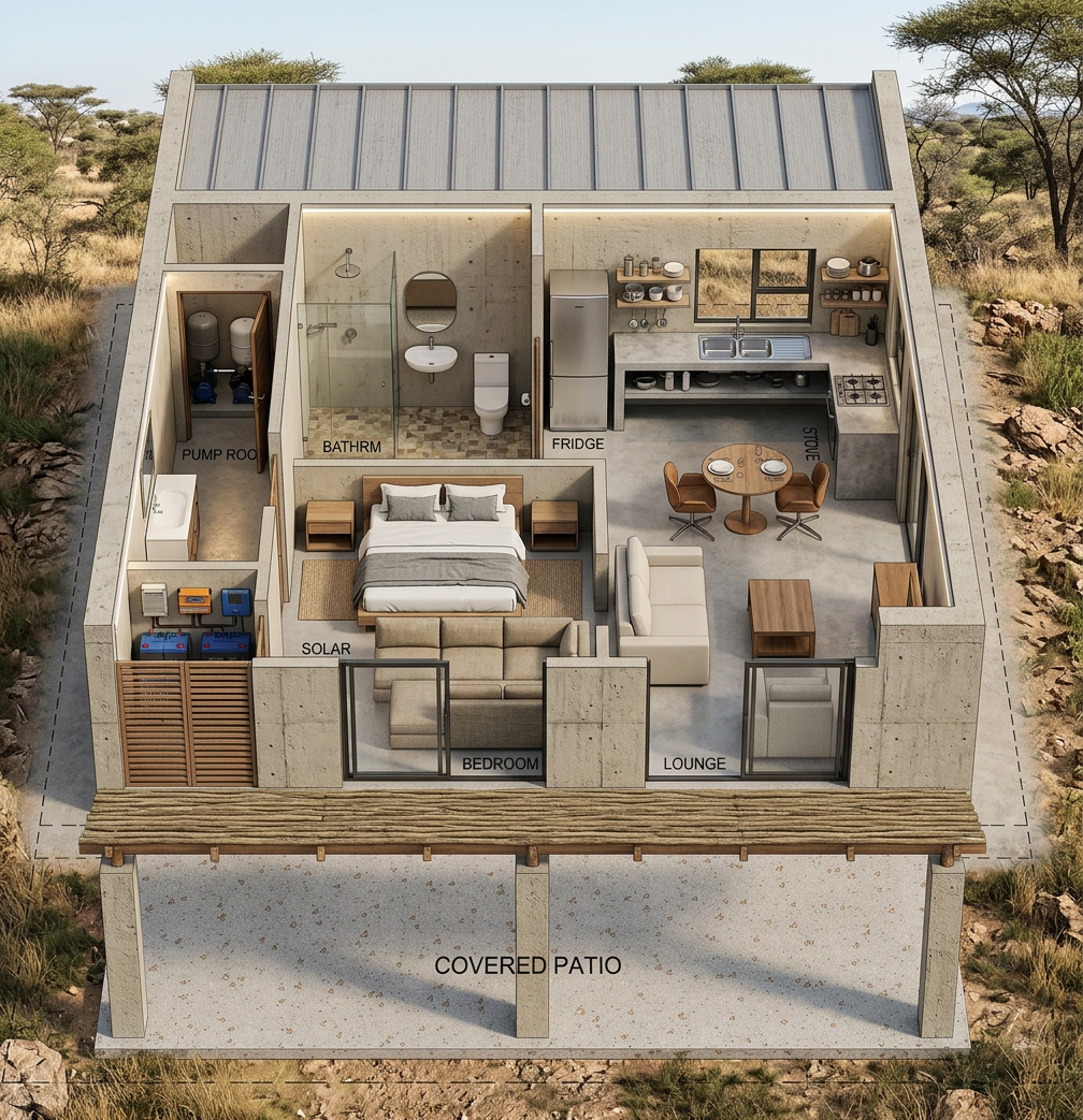 black composite tile roof grey stacked stone accents stucco walls and black framed windows exterior lighting dusk