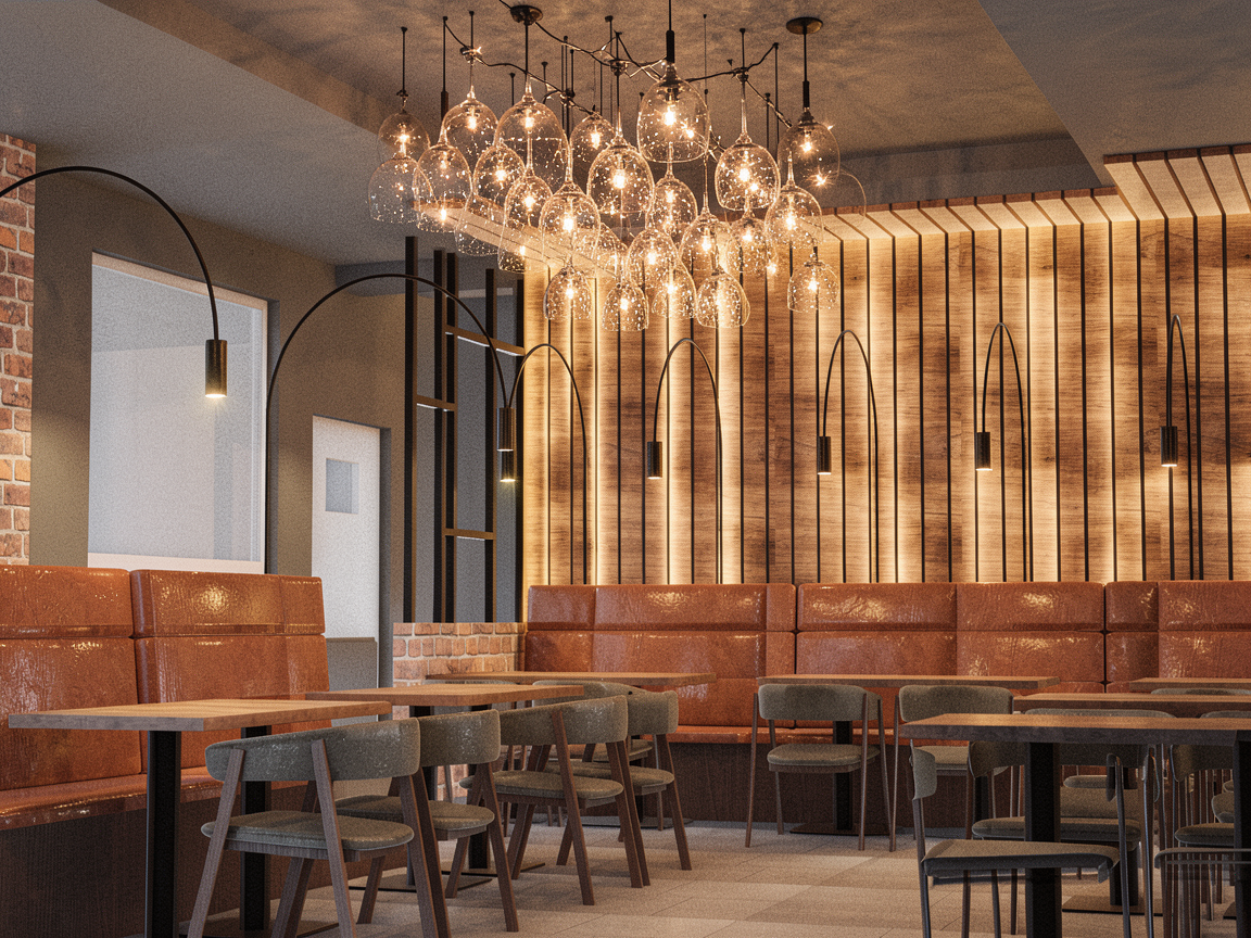 refine the previously generated image while strictly preserving the exact camera perspective layout furniture placement and architecture important correction bring back the hanging wine glass installation in the central ceiling area the wine glasses must be clearly visible again and remain an important design feature above the tables wine glass installation reintroduce a dense but elegant arrangement of hanging clear wine glasses in the central ceiling zone the wine glasses must be realistic in size with a maximum height of 30 cm they should hang slightly further forward more above the tables and closer to the viewer keep them visually present but organized and refined vary the hanging heights slightly to create depth use nearly invisible suspension lines the glasses must not emit light and must not contain bulbs lighting for the glasses the wine glasses should only reflect and refract surrounding light naturally add very subtle realistic highlights on the rims and edges of the glasses integrate soft warm micro led string lights or concealed linear lighting into the black ceiling grid structure but keep the lighting discreet and physically believable no random floating sparkles no excessive glitter effect no decorative fairy light look back wall clearly keep and emphasize the warm vertical led light strips between the walnut wood slats the wall lighting should create depth and warm gradients on the walnut surface the walnut wood must look natural rich and realistic materials matte black ceiling black floor tiles with subtle matte texture warm brown leather seating with natural texture and low gloss realistic walnut wood slats with variation in grain and tone atmosphere and realism warm soft indirect restaurant lighting cozy and elegant not flashy reduce cgi look completely reduce glossiness and over sharpness add slight imperfections realistic reflections natural light falloff soft shadows and a photographic feel the final image should look like a real high end restaurant photo with a clearly visible hanging wine glass installation soft integrated lighting and warm illuminated walnut wall slats