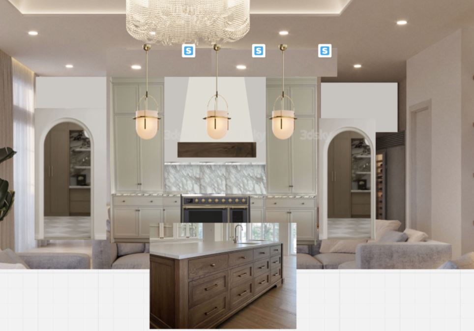 make this look like a rendering and add floro to ceiling cabinets to the right wall by refrigerator and flooring in a chevron pattern island to be in front of kitchen with pendants over the island
