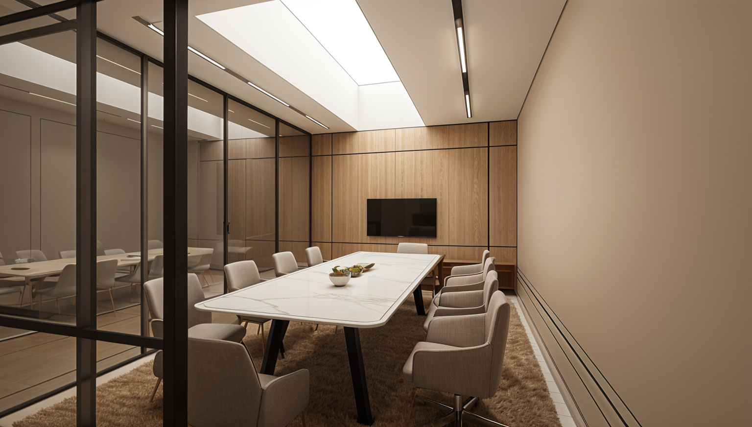 exterior shot interior shot render a hotel chic meeting room with a refined and contemporary atmosphere a large elegant meeting table centered in the space surrounded by comfortable upholstered chairs in soft neutral tones inspired by the moodboard walls finished with textured wall coverings and accents in a warm rich dark green inspired by nature creating a subtle indoor outdoor connection and a calm grounding feel introduce steel framed sliding glass doors with clear glass for a refined industrial touch the floor remains a warm herringbone wood pattern enhancing the cozy yet professional character the ceiling stays a clean white suspended ceiling system with integrated lighting unchanged in layout the existing wall mounted screen remains in place as a functional focal point materials textures and colors are inspired by the provided moodboard layered textiles muted taupes warm woods and soft contrast interior shot render a hotel chic meeting room with a refined and contemporary atmosphere a large elegant meeting table centered in the space surrounded by comfortable upholstered chairs in soft neutral tones inspired by the moodboard walls finished with textured wall coverings and accents in a warm rich dark green inspired by nature creating a subtle indoor outdoor connection and a calm grounding feel introduce steel framed sliding glass doors with clear glass for a refined industrial touch the existing floor remains exactly as it is including the current herringbone wood pattern tone and direction the existing suspended ceiling system remains unchanged including panel layout fixtures and lighting positions the existing skylight light well remains fully intact unchanged in size position and appearance the existing wall mounted screen remains in place as a functional focal point cable ducts may be painted to blend subtly into the wall finish the loose office chair is removed materials textures and colors are inspired by the provided moodboard layered textiles muted taupes warm woods and refined contrast soft natural daylight combined with calm artificial lighting creates a welcoming high end hotel meeting room atmosphere no changes to room proportions structure perspective or architectural elements
