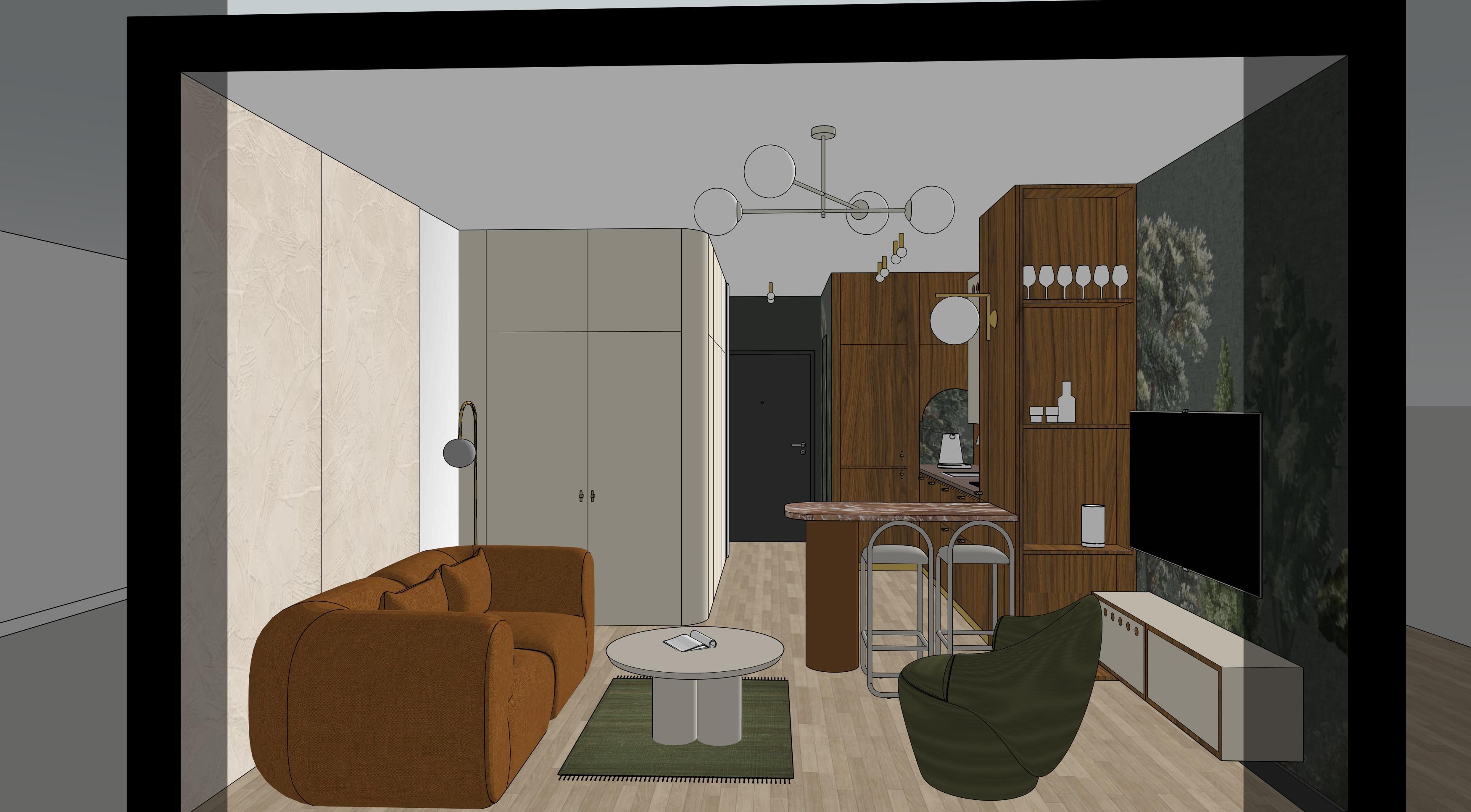 fotorealistyczna wizualizacja nowoczesnego eleganckiego salonu z aneksem kuchennym w w skim mieszkaniu styl modern organic z nut mid century uj cie na wprost perspektywa z wysoko ci oczu szerokok tny obiektyw 24 28 mm proporcje realistyczne uk ad przestrzeni w ska pod u na przestrze typu open space po lewej stronie strefa wypoczynkowa po prawej zabudowa rtv i kuchnia z p wyspem na ko cu widoczny ciemny korytarz z drzwiami wej ciowymi materia y i wyko czenia ciana lewa du e panele dekoracyjne z jasnego ciep ego tynku strukturalnego efekt wapiennej glinki limewash kolor z amana biel z delikatn faktur i subtelnymi przetarciami matowe wyko czenie delikatna gra wiat a na fakturze pod oga naturalna jasna deska d bowa wyko czenie matowe lekko szczotkowana struktura ciep y odcie ciana prawa tv tapeta artystyczna w ciemnych nastrojowych tonach g boka ziele grafit motyw drzew pejza u w stylu malarskim matowe wyko czenie lekko tekstylna struktura zabudowa stolarska kuchnia rtv naturalny fornir orzechowy ciep y odcie wyra ne us ojenie satynowe wyko czenie fronty bezuchwytowe minimalistyczne dolna szafka rtv w kolorze ciep ego be u taupe matowa blat p wyspu kamie naturalny lub spiek kwarcowy jasny be z subtelnym u yleniem satynowe wyko czenie meble sofa ob a masywna tapicerowana w ciep ym karmelowo rdzawym kolorze tkanina boucle lub mi kka plecionka mi kkie organiczne kszta ty fotel nowoczesny rze biarski w kolorze g bokiej oliwkowej zieleni matowa tkanina stolik kawowy okr g y minimalistyczny jasny kamie lub lakier matowy geometryczna podstawa hokery metalowa konstrukcja w kolorze jasnoszarym lub chrom siedziska tapicerowane w jasnym be u o wietlenie wiat o dzienne mi kkie rozproszone wpadaj ce z lewej strony niewidoczne okno naturalne wiat o poranne lub p nopopo udniowe ciep a temperatura barwowa 4000k subtelne realistyczne cienie o wietlenie sztuczne designerski yrandol sufitowy z kulistymi mlecznymi kloszami szk o opalowe kinkiet przy sofie z ota rama szklana kula ma e reflektory sufitowe w strefie kuchni nastrojowe ciep e wiat o akcentuj ce zabudow led pod p kami wiat o realistyczne global illumination naturalne odbicia materia w delikatne soft shadows dodatki telewizor p aski czarna tafla szk a subtelne odbicia wn trza na p kach szk o kieliszki ceramika w neutralnych barwach na stoliku otwarta ksi ka ma y dywan w kolorze zgaszonej zieleni minimalistyczne dekoracje parametry renderu ultra photorealistic 8k resolution v ray corona renderer style global illumination physically accurate materials soft natural shadows high dynamic range cinematic color grading subtle depth of field realistic reflections and fabric texture no distortion no overexposure