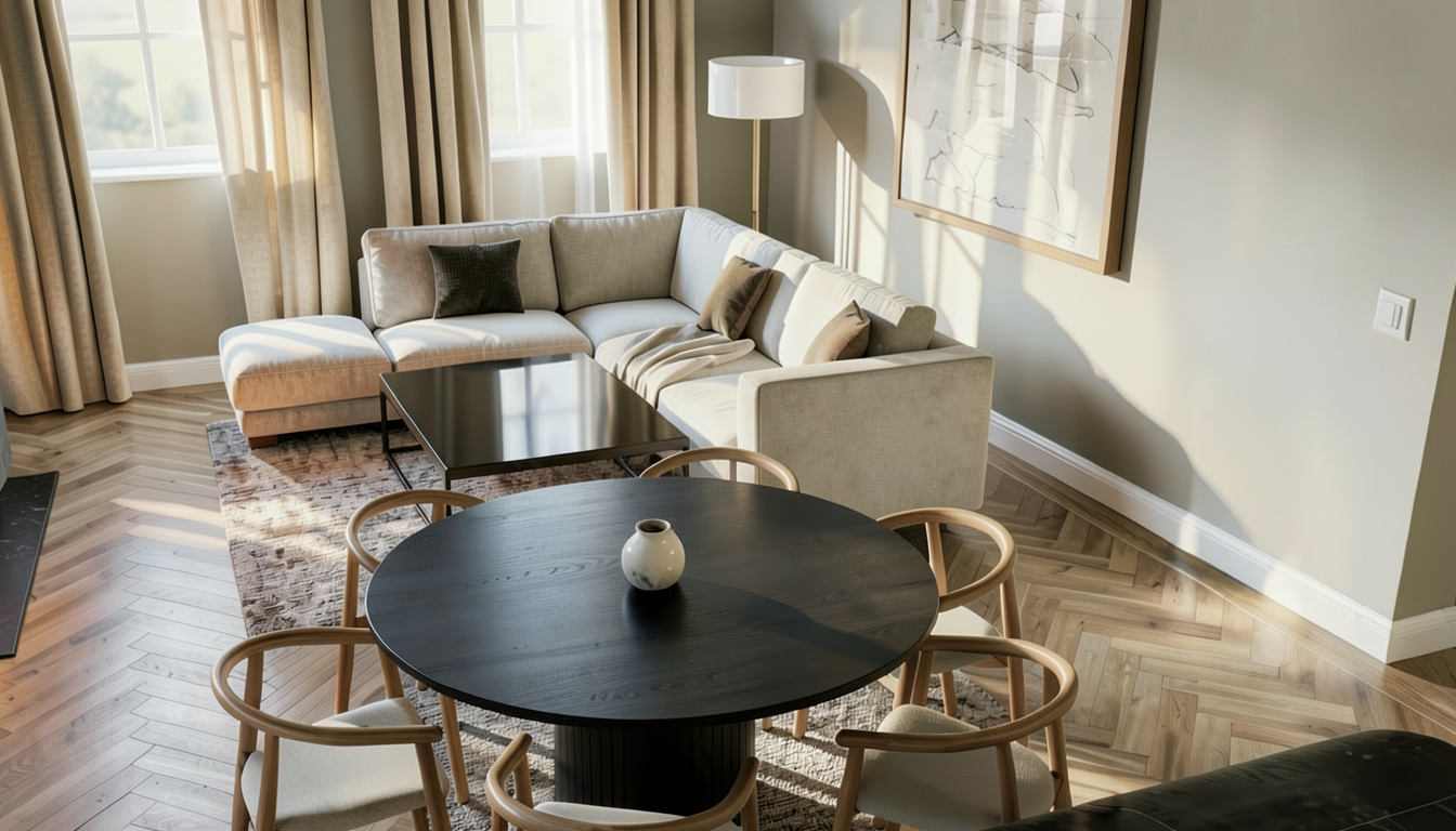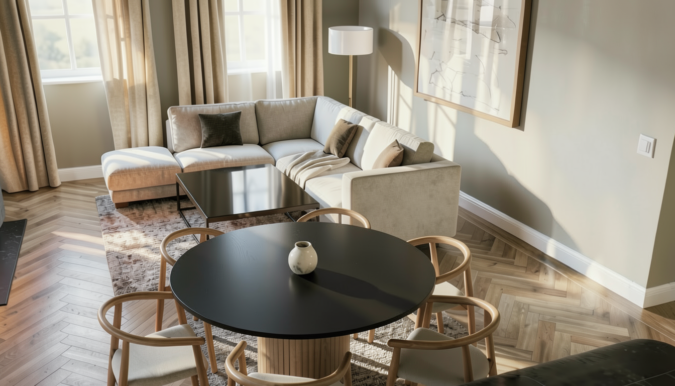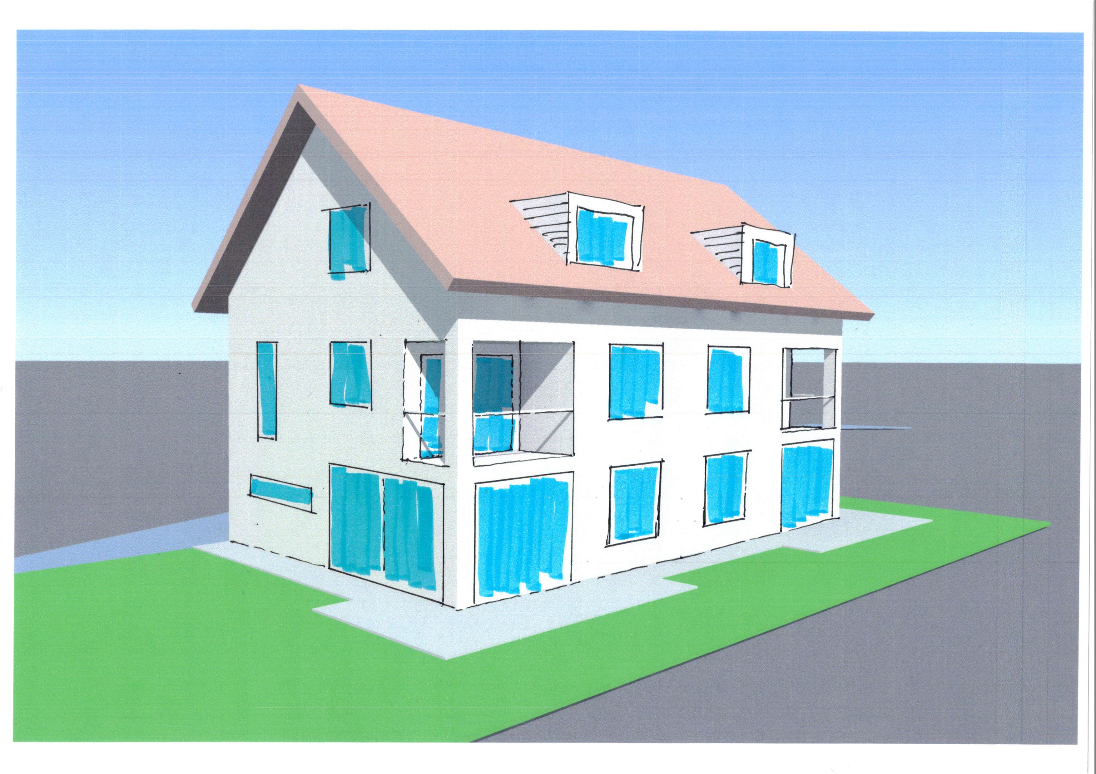 exterior shot sunny with clouds modern city behind trees behind the house grey roof grey windows on the roof tree on the left side groud floor facade should be grey kids playing in front architecture