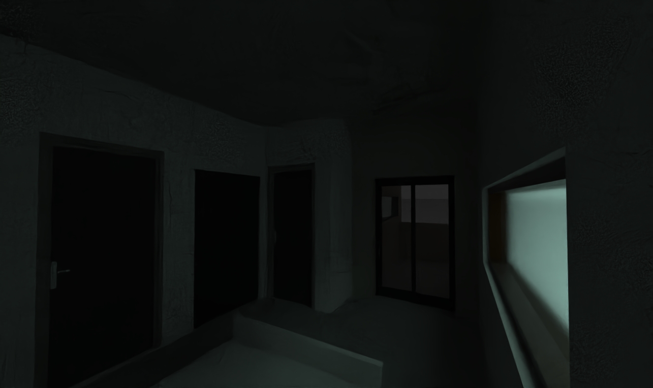 imagine ultra realistic architectural interior rendering of a two story accessory dwelling unit adu second floor bedroom interior view with recessed balcony minimalist tropical modern architecture inward facing private sleeping space carved from a monolithic concrete or plaster mass thick walls with deep window and door reveals recessed second floor balcony integrated into the building volume filtered daylight entering from the balcony opening and narrow horizontal slot window low light interior atmosphere emphasizing enclosure and retreat soft indirect daylight minimal artificial lighting calm and contemplative mood smooth but imperfect plaster or concrete textures simple flush interior doors no decoration no furniture emphasis strong shadow depth quiet material palette professional architectural visualization eye level interior perspective raw realism ar 4 3 style raw