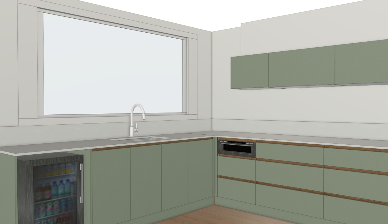 add natural lighting into space add kitchen decor have a lady standing at the sink washing her hands make the window frame black change to one big window