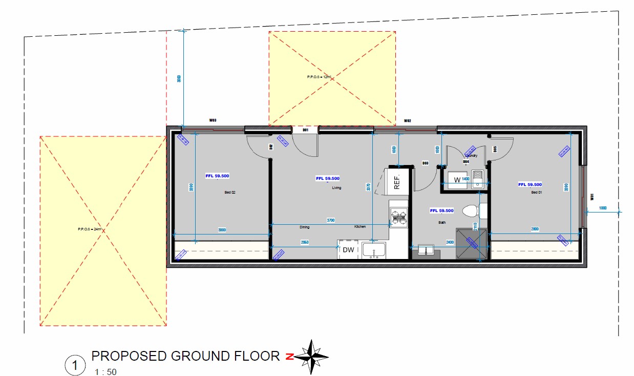 add a 10sqm alfresco 3 sqm porch add 2nd small toilet as reference image somewhere keep total external building area is 60 sqm move the living area where the bed 2 is add 10sqm alfresco where the exit from living area add a 920mmx2340 door between living and alfresco keep the current set back as it is do not move the footprint