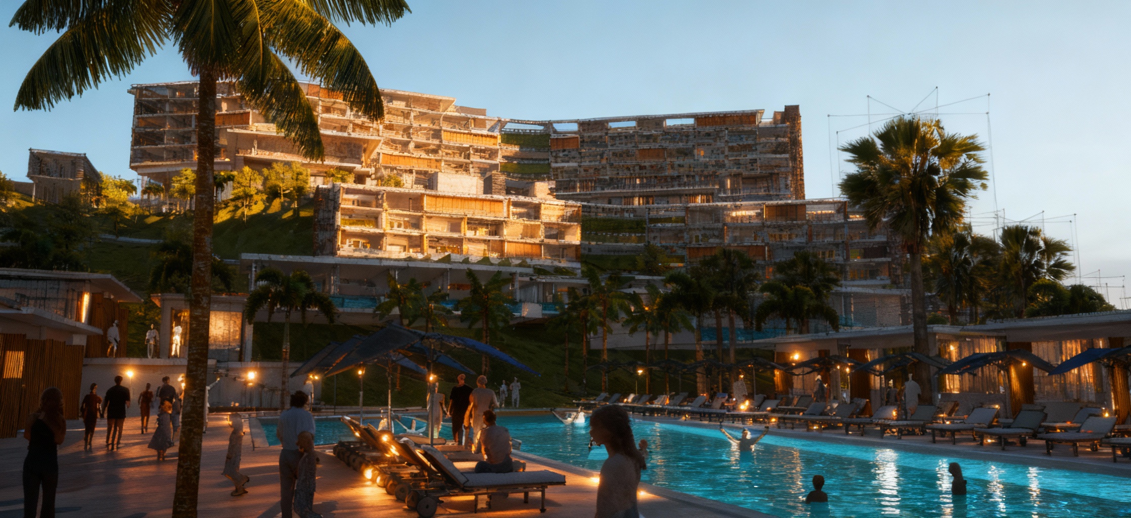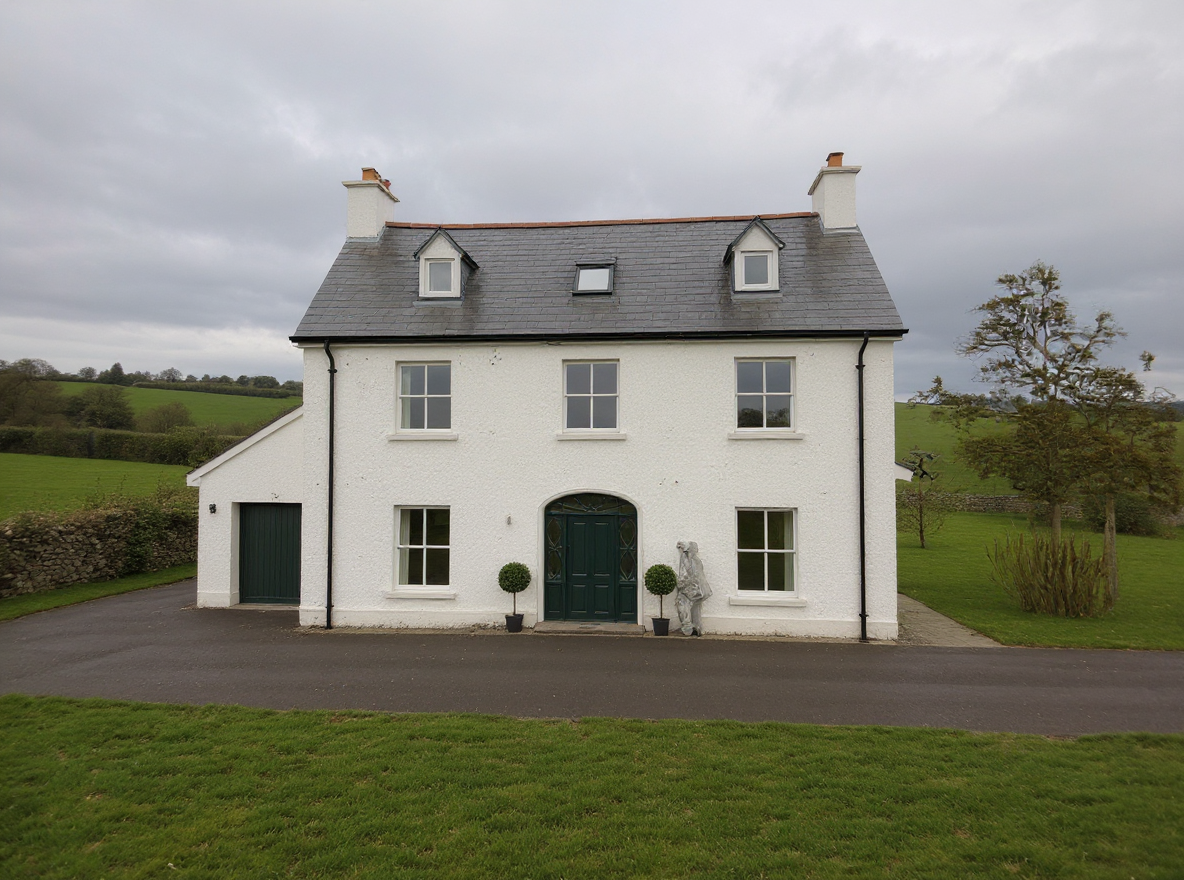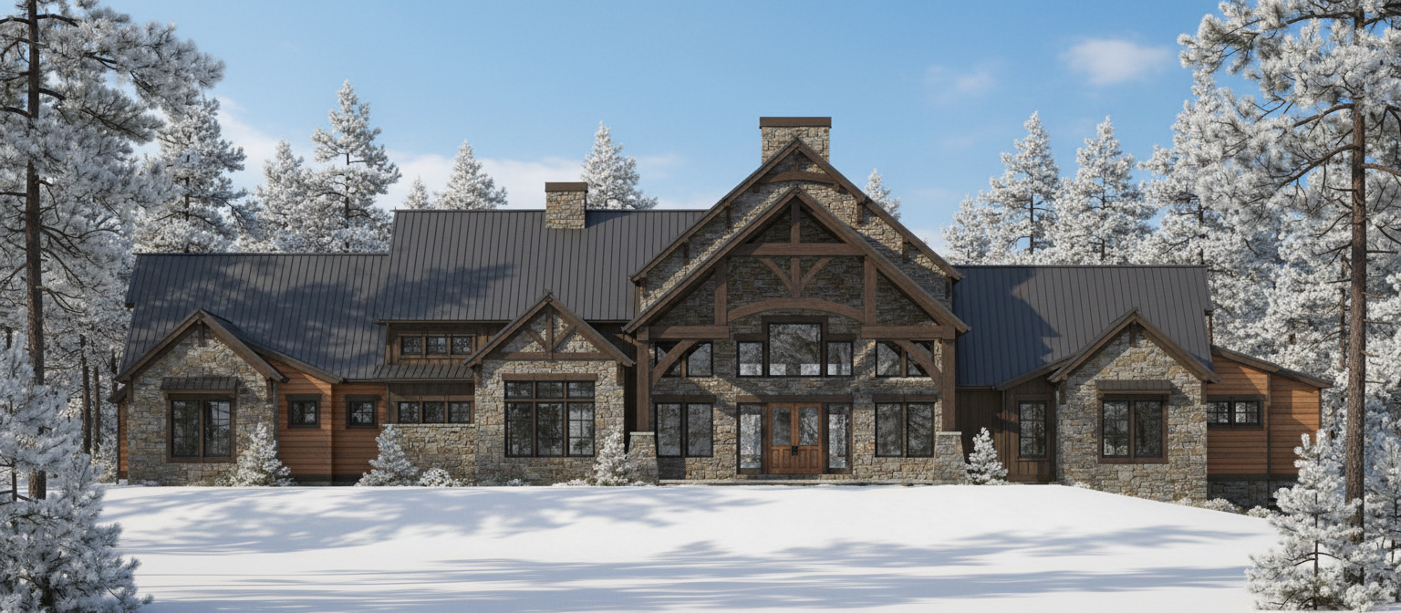 render a photorealistic 3d perspective of this house add more landscaping and trees make the concrete walkway more realistic