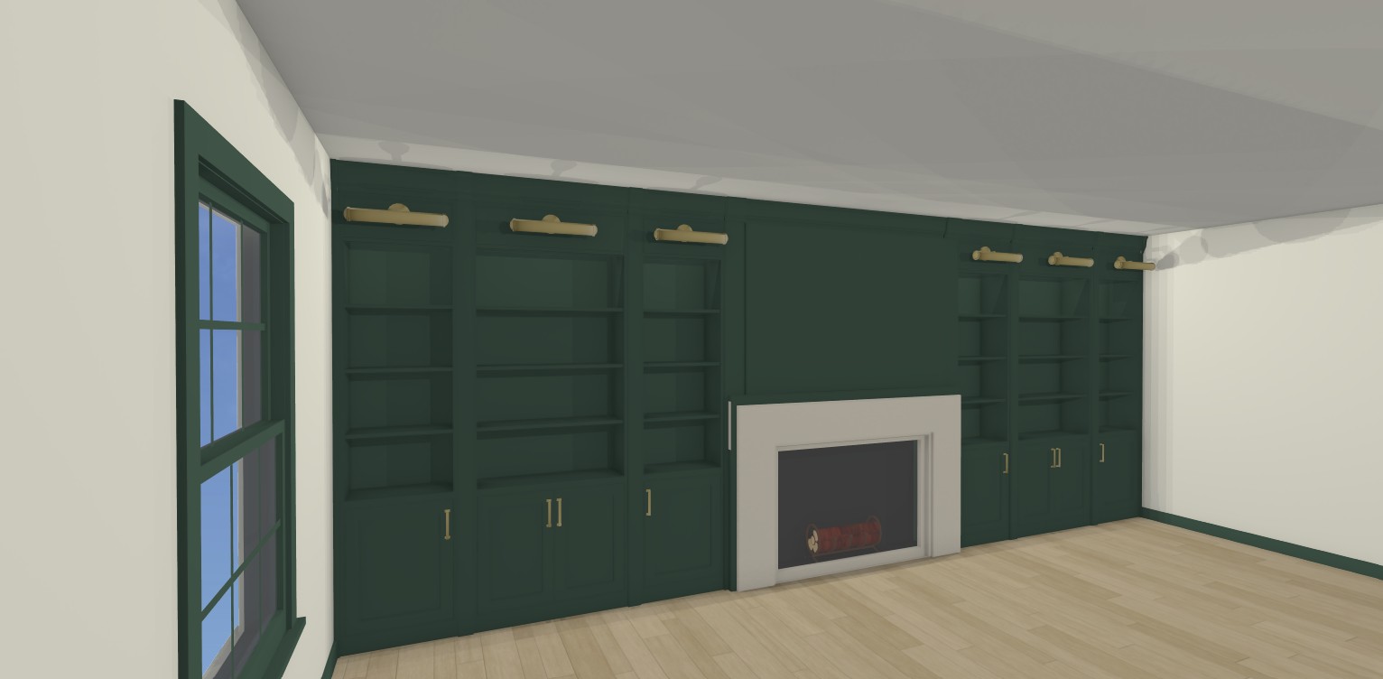 photorealistic interior architectural rendering of a sophisticated living room with deep olive green built in cabinetry spanning the entire wall classic shaker style panels integrated lower cabinets with brushed brass handles open shelving above with warm brass picture lights mounted above each section a central modern fireplace with a limestone minimalist mantel surround integrated into the millwork abstract art hanging above the fireplace light natural oak hardwood flooring off white walls dark green window trim with a deep sill soft ambient evening lighting realistic shadows subtle ceiling imperfections warm indirect lighting 35mm lens eye level perspective ultra detailed textures natural light from side window high dynamic range architectural photography style 8k resolution