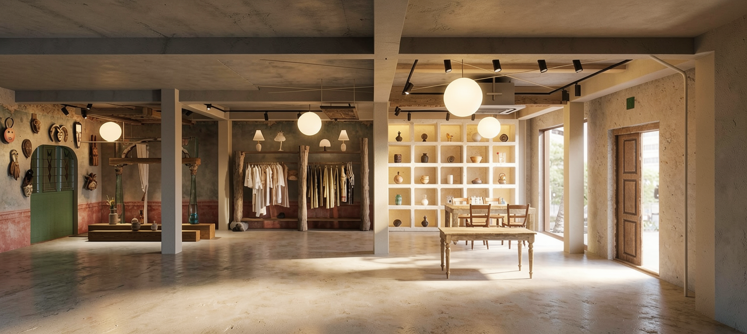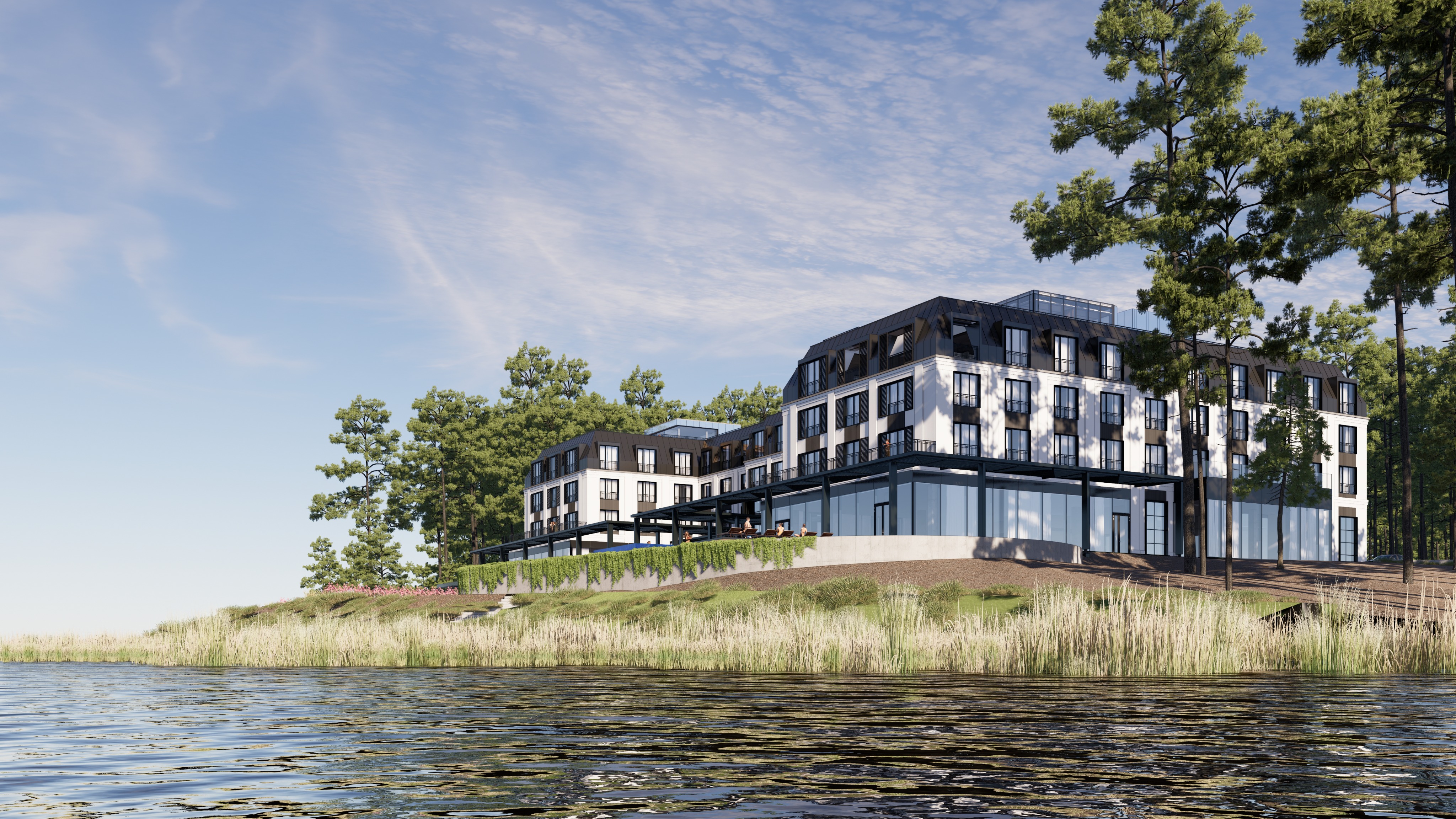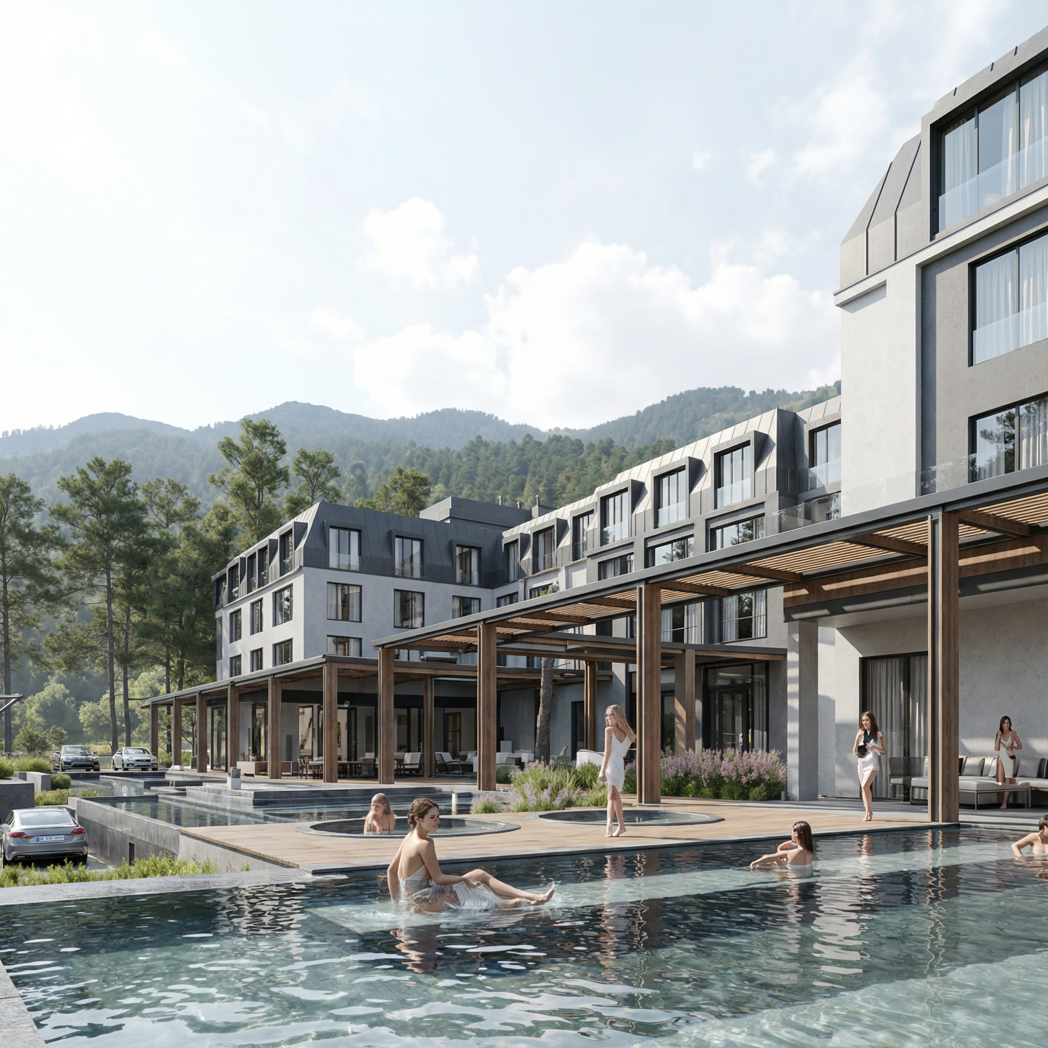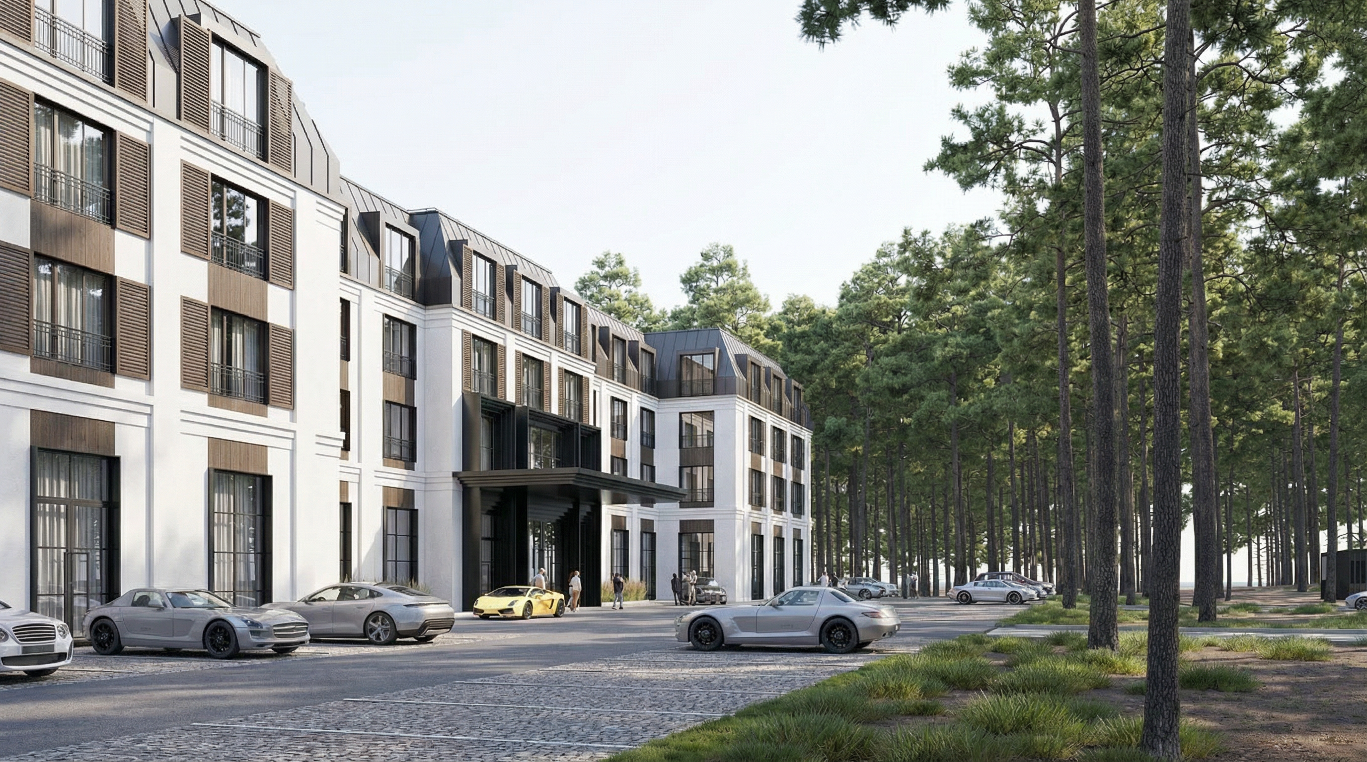 exterior shot transform this non realistic visualization into a highly photorealistic render while keeping the exact architecture proportions openings and overall composition unchanged replace all simplified or flat materials with realistic physically based ones that keep the same main color scheme but look natural and convincing matte and semi gloss paints plaster and concrete with subtle texture realistic wood with visible grain metal with soft reflections and glass with depth and transparency avoiding any plastic or cartoon look change the background environment to a realistic forest context with tall pine trees pinus sylvestris 15 25m high dense stand of high pines surrounding the scene with tall trunks natural canopy and dappled light filtering through branches between the trees show wild low grass or forest litter like pine needles and undergrowth without changing any existing green areas in the foreground or site add subtle natural gloss to all exterior materials according to their type with believable specular highlights and soft reflections especially on metal stone and painted surfaces enhance the windows with realistic reflections of the sky trees and surroundings in the glass while keeping interior dark enough to avoid a fake look show vertical fabric curtains inside the windows in light slightly translucent textiles hanging in soft folds partially open consistent across all glazed areas realistically enhance only the paved road surfaces visible in the scene replacing them with typical granite cobblestone paving with irregular joints subtle wear and realistic texture while leaving all green terrains untouched populate the scene with a few realistic contemporary cars parked or driving on the street correctly scaled to the building with detailed bodywork glass reflections and proper contact shadows on the ground optionally add a few subtle human figures in the distance for scale without drawing too much attention dressed in everyday clothes set the lighting to a bright high key daytime mood soft even daylight with minimal deep shadows bright sky high overall exposure low contrast and very light midtones like in high key architectural photography maintain crisp but soft shadows close to the building avoid dramatic contrast or dark areas and keep colors clean and slightly desaturated for a fresh airy look the final result should be ultra realistic high detail bright high key exterior architectural photography style