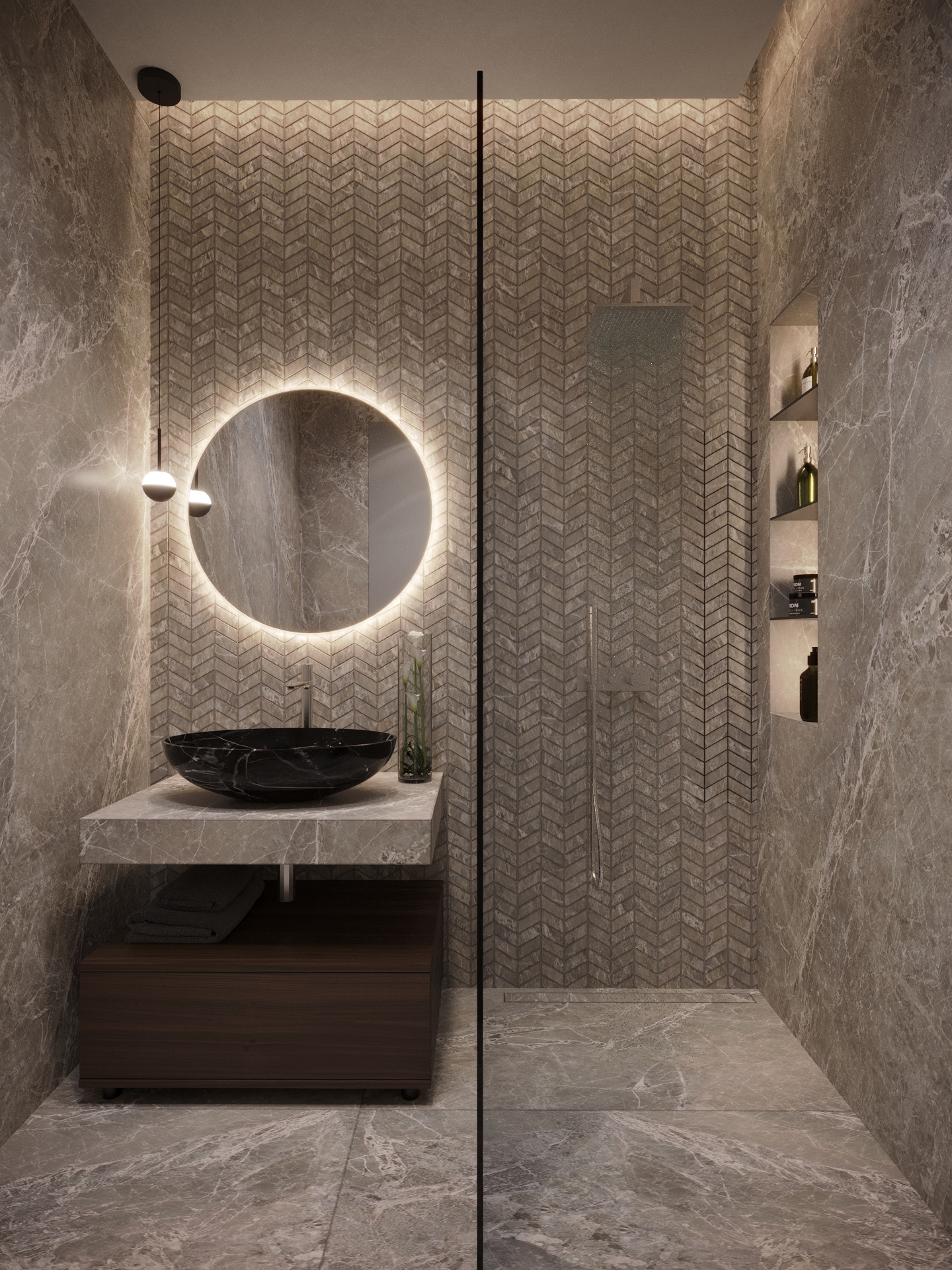 modify the photorealistic visual design the flowers in the vase on the counter should be taller and larger with one leaning toward the mirror under the counter on top of the drawer there are colorful soaps in a woven light gray leather basket the mirror reflects the blurred image of a tall blonde long haired young woman with scandinavian features seen from the side water from the shower collects in small puddles on the floor everything else remains unchanged the spatial configuration the colors the furniture and the dimensions