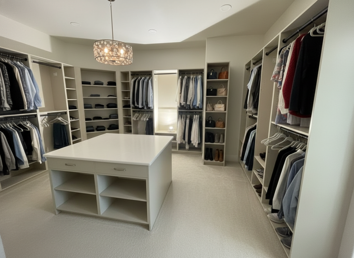 stage this closet for a realtor showing clean up everything on the floor replace with white carpet there is a spotlight on the back wall that needs to be removed and the lighting in the room needs to be adjusted to reflect the light from the chandelier and fill the closet with hanging clothes shoes purses folded clothes as well as the countertop