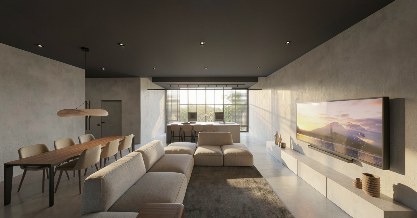 architectural photography overcast autumn day soft diffused natural lighting moody atmosphere soft glowing sunlight highly detailed shot on sony a7r iv 35mm lens photorealistic subtle scuff marks and soft reflections on hardwood floors realistic material wear 8k resolution cinematic lighting volumetric rays a stack of high end architectural magazines next to a wabi sabi ceramic vase with dried pampas grass photorealistic subtle lighting large abstract minimalist canvas art with heavy impasto texture above sofa neutral earth tones gallery lighting a wooden cutting board with a freshly sliced artisan sourdough loaf and a matte black espresso machine editorial interior photography